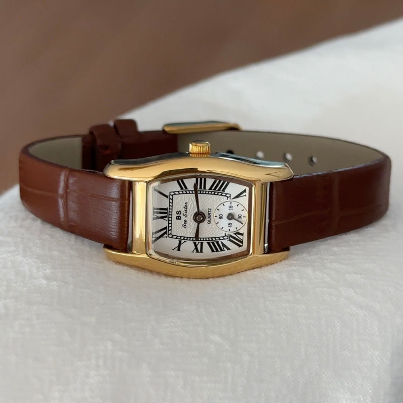 Elegant Barrel White Dial Gold Watch with Brown Leather Strap and Quartz