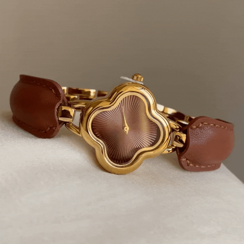 A stylish women’s quartz watch featuring a gold four-leaf-clover case, brown dial, and genuine brown leather strap. Elegant, minimal, and easy to pair with any outfit. Perfect for daily wear or gifting.