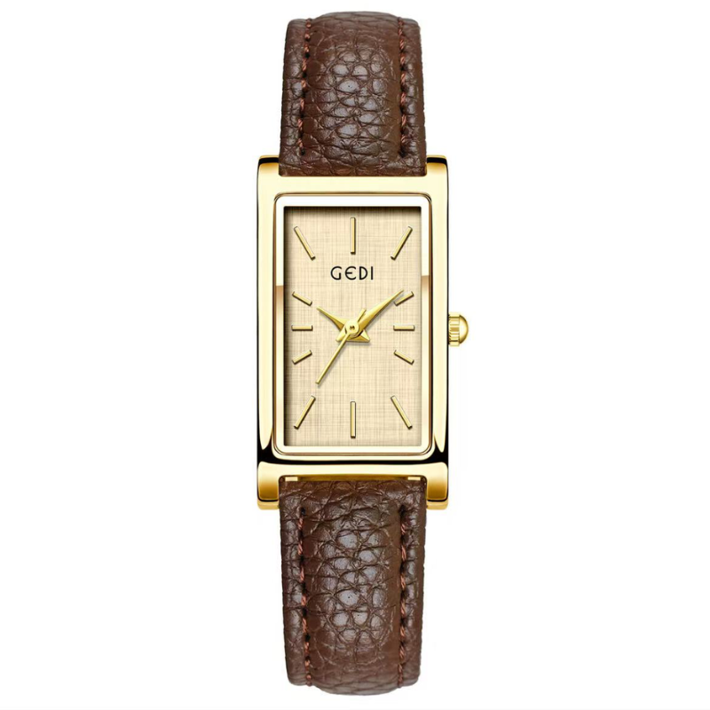 Elegant Square Watch with Gold Dial & Brown Genuine Leather Strap