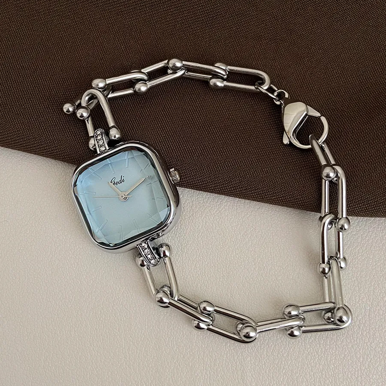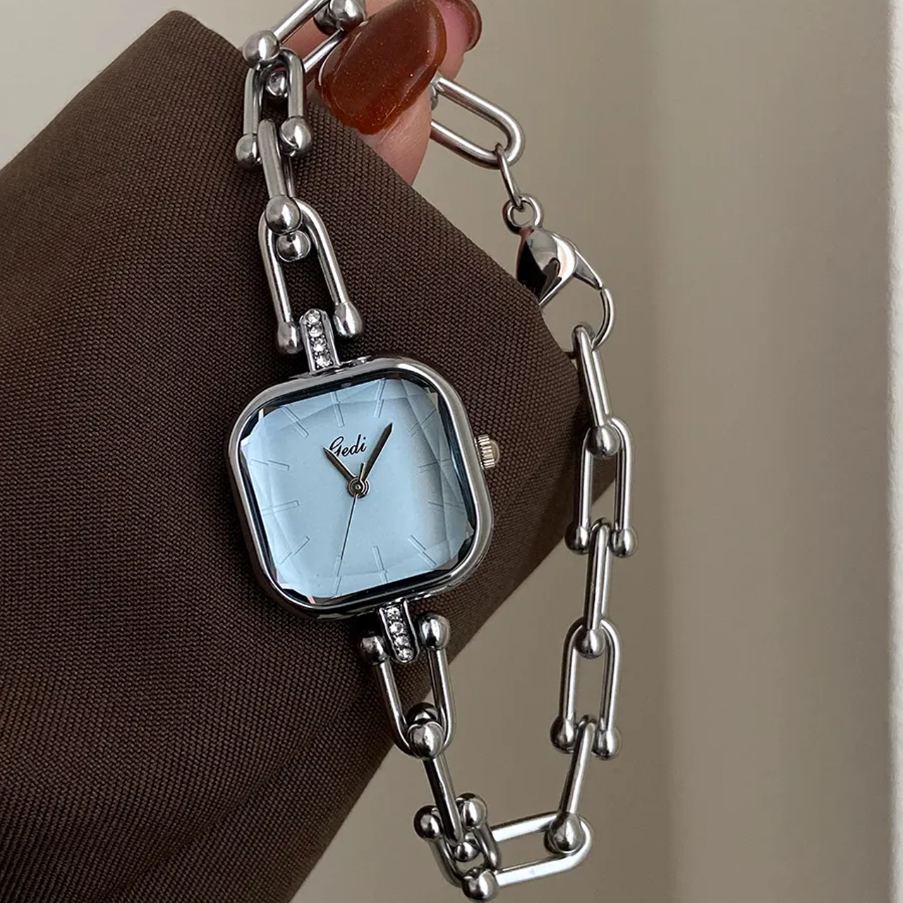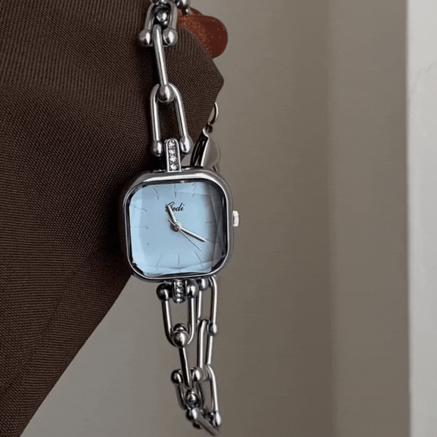 Este exquisito reloj para mujer combina un elegante brazalete plateado con una cautivadora esfera azul, creando una armoniosa combinación de elegancia moderna y diseño atemporal. La correa tipo brazalete realza su sofisticación, convirtiéndolo en el accesorio perfecto tanto para ocasiones informales como formales. Fabricado con materiales de primera calidad y una impecable atención al detalle, este reloj encarna una estética refinada, ideal para quienes aprecian el lujo discreto y la versatilidad.