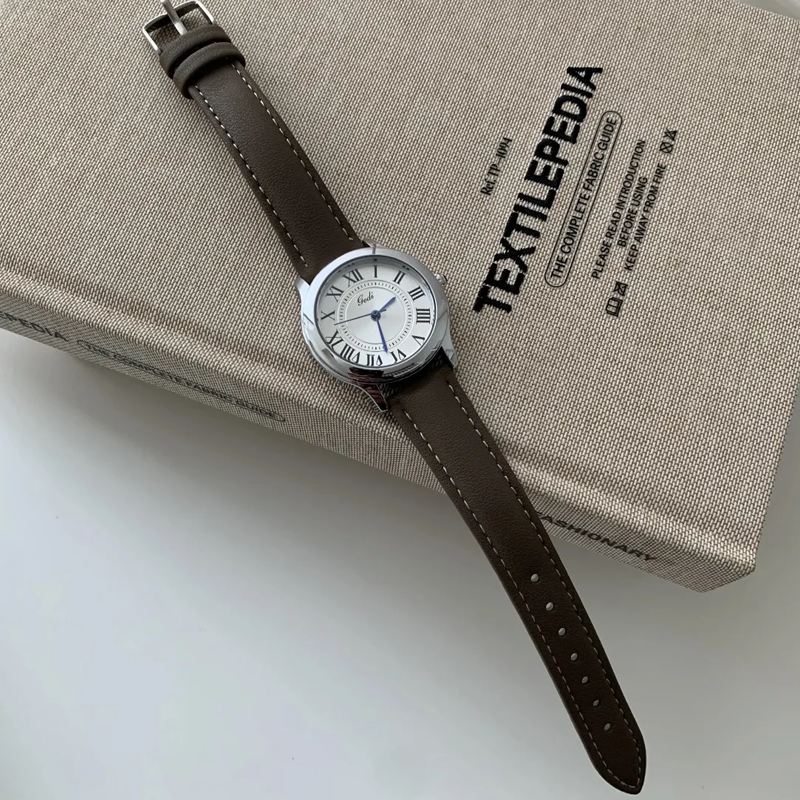 Cuero gris elefante con dial de plata romano: reloj de cuarzo para mujeres