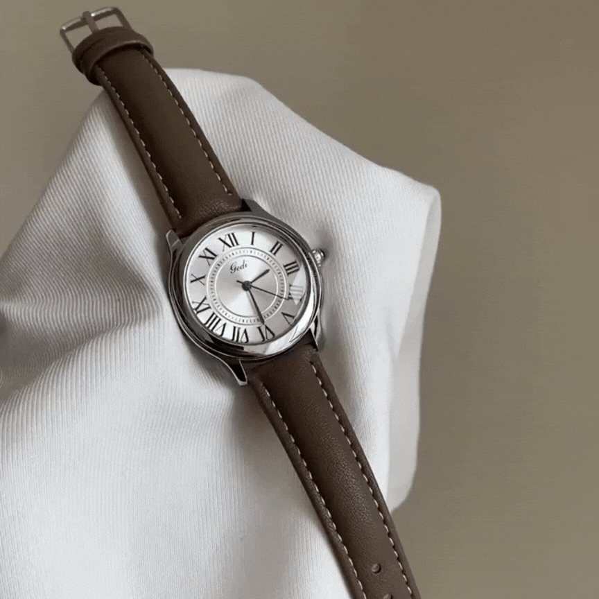 Una mezcla atemporal de elegancia y sofisticación, este reloj de cuarzo para mujer presenta una correa de cuero genuino gris elefante, una caja en tono plateado y una esfera plateada redonda con marcadores de números romanos clásicos para un encanto vintage refinado.