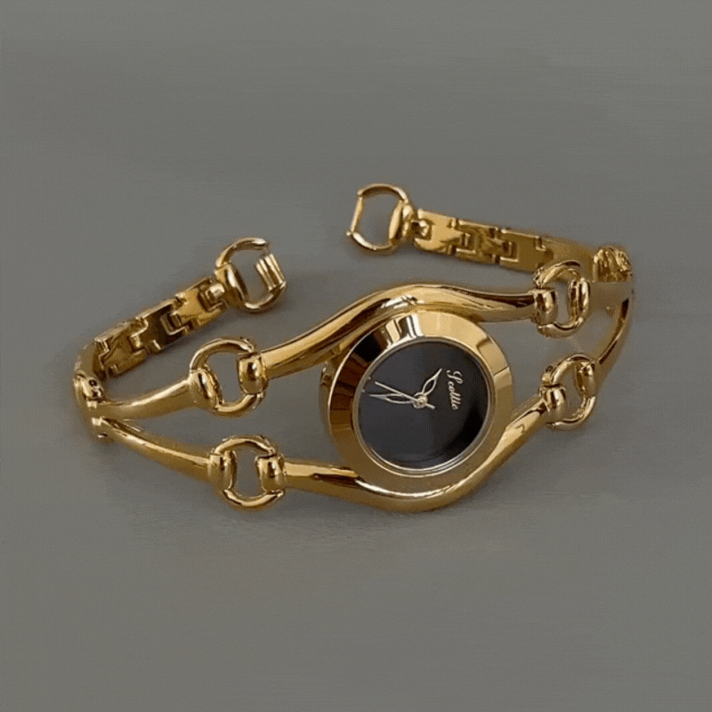 Este reloj de cuarzo para mujer cuenta con una elegante esfera redonda negra situado en un estuche de estilo vintage, acentuado por un icónico diseño de enlace de bocado de caballoLos detalles refinados evocan la elegancia ecuestre, mientras que la silueta general se siente atemporal y moderna, como una pulsera llamativa que marca la hora.