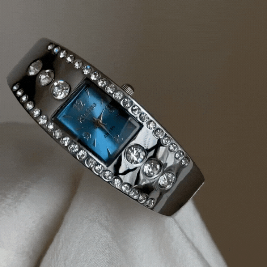 Este elegante reloj de cuarzo cuenta con una elegante esfera rectangular azul enmarcado en un pulsera estilo brazalete de plata con acentos de cristal brillanteRefinado y llamativo, es una mezcla perfecta de glamour moderno y sofisticación cotidiana.
