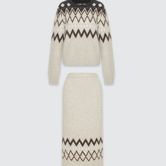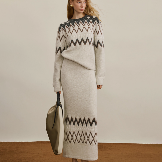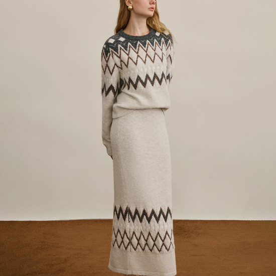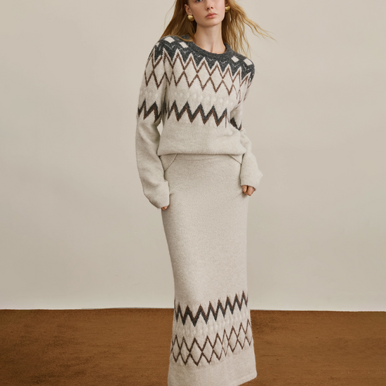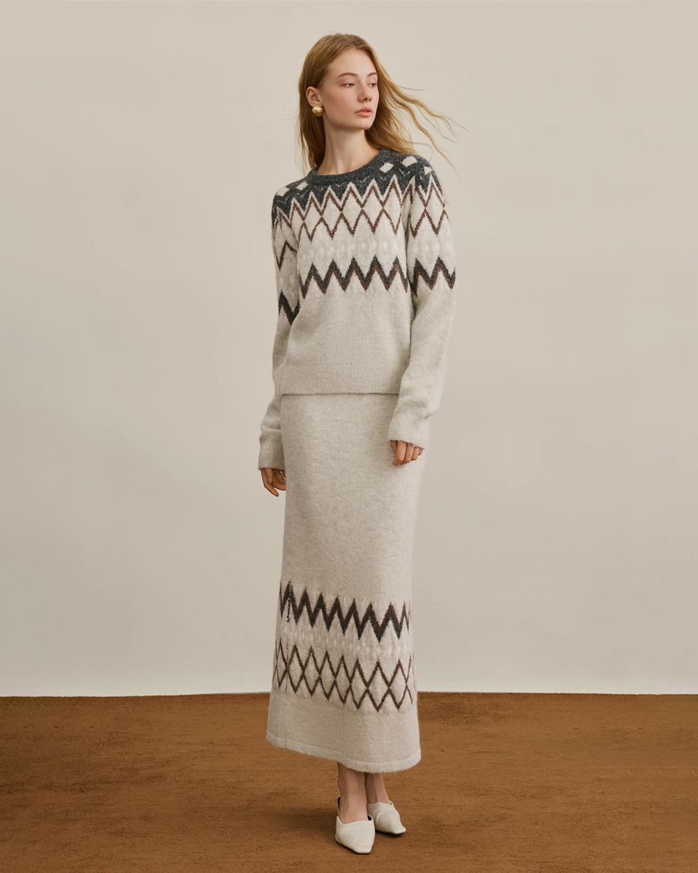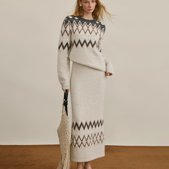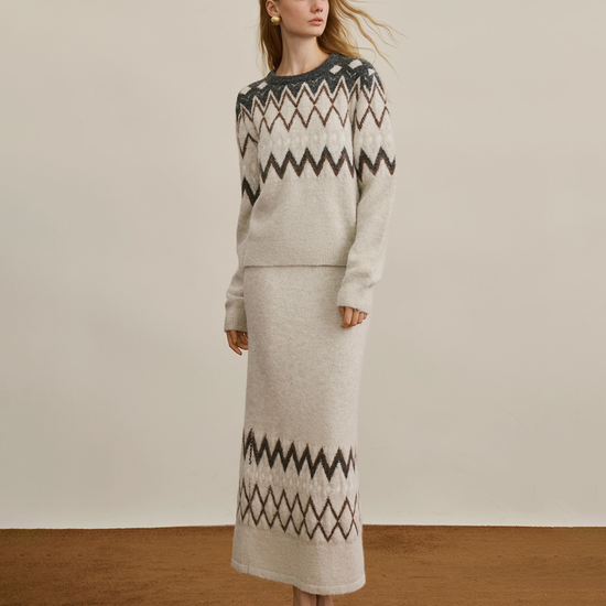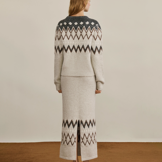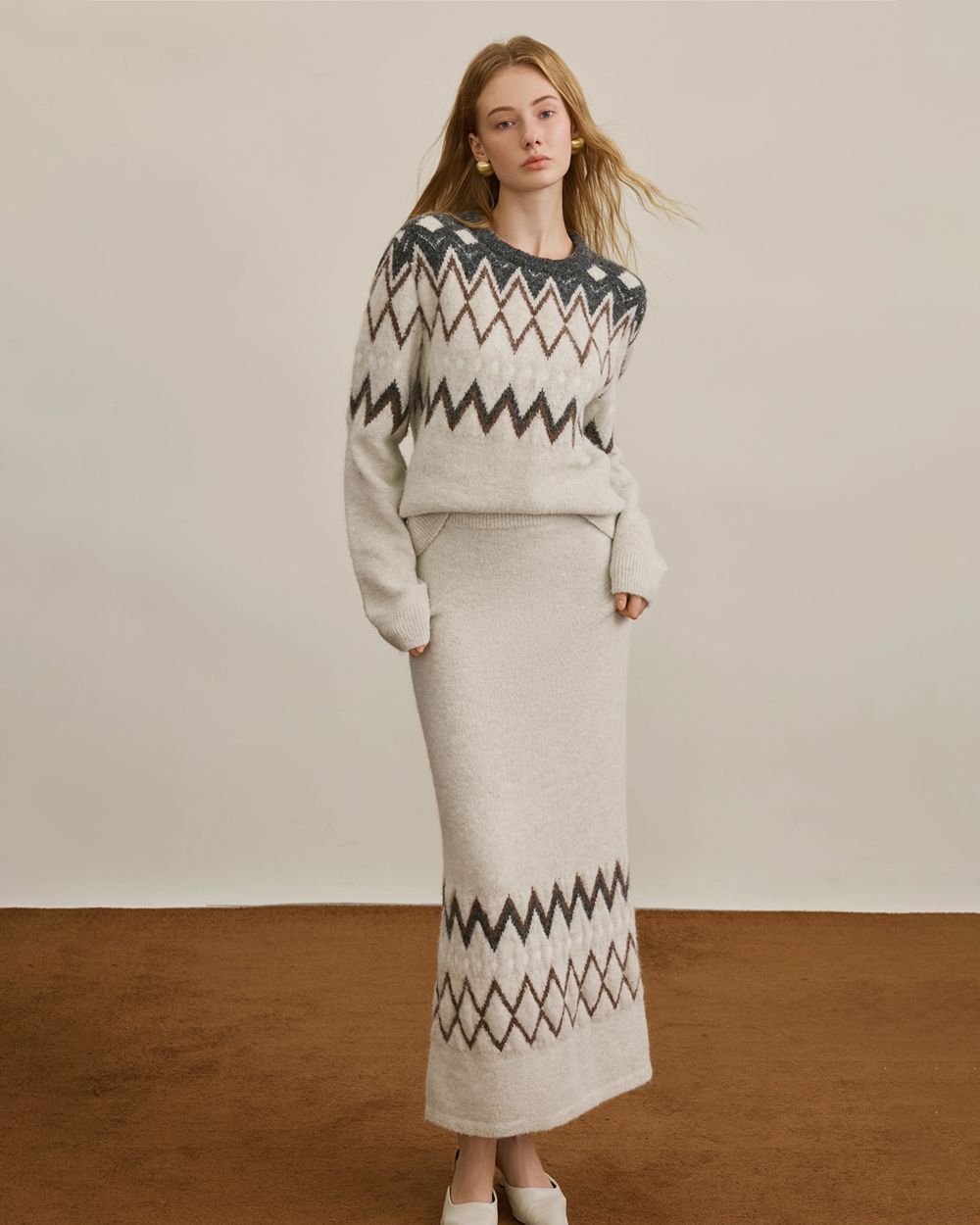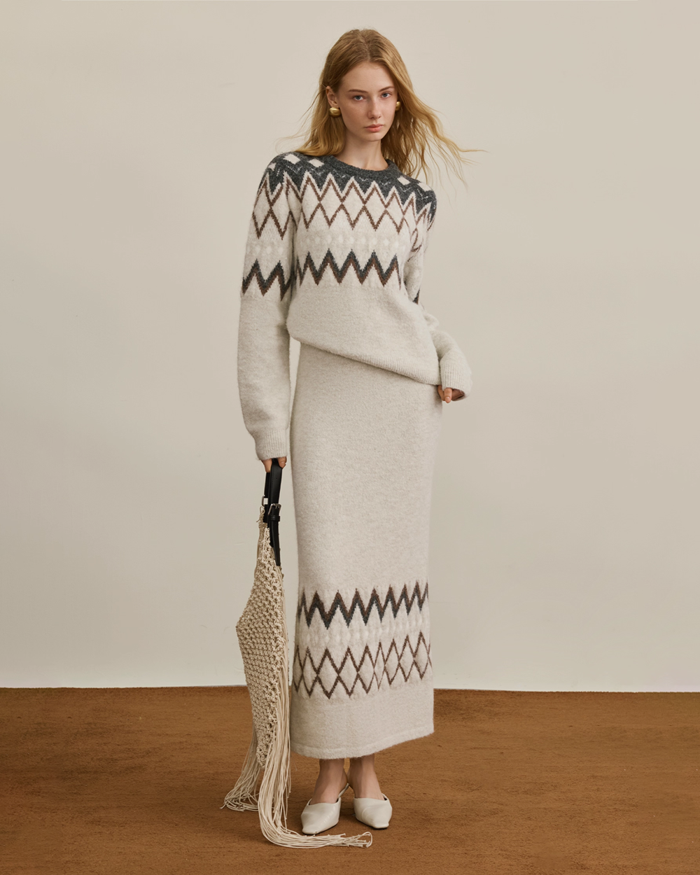 Fair Isle Round-Neck Sweater Side-Slit Skirt Set