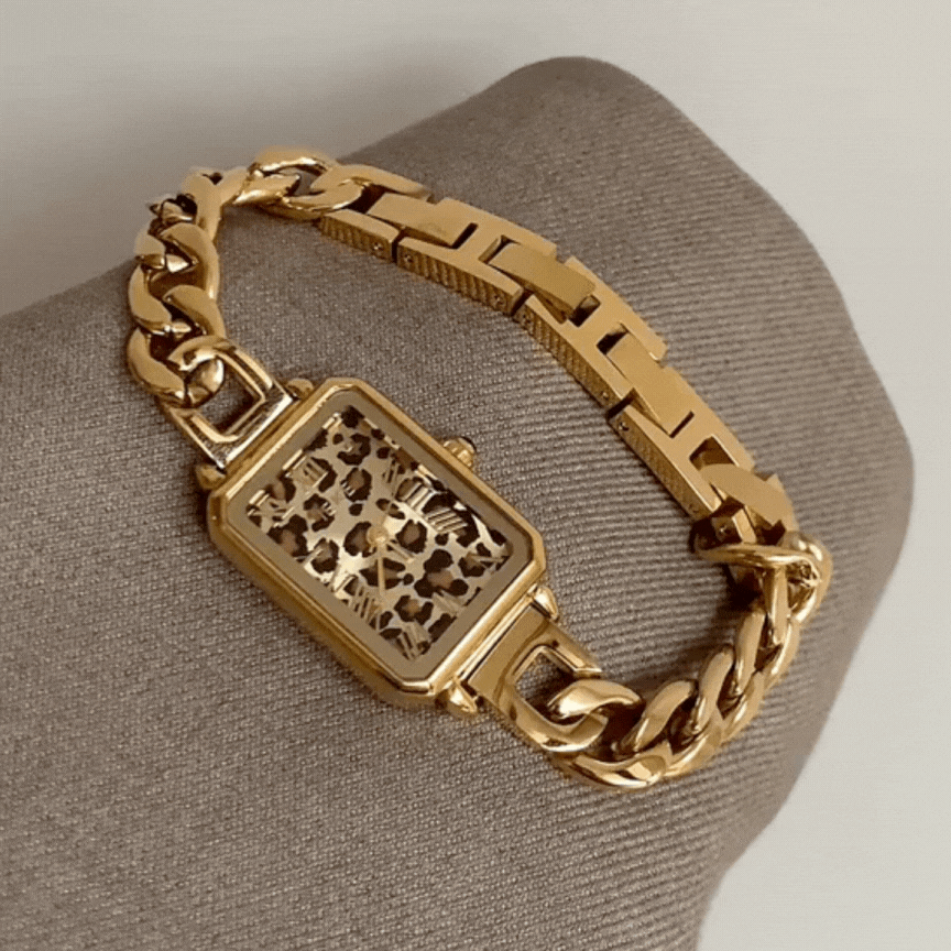 Rectangular leopard print dial with a bold, stylish flair