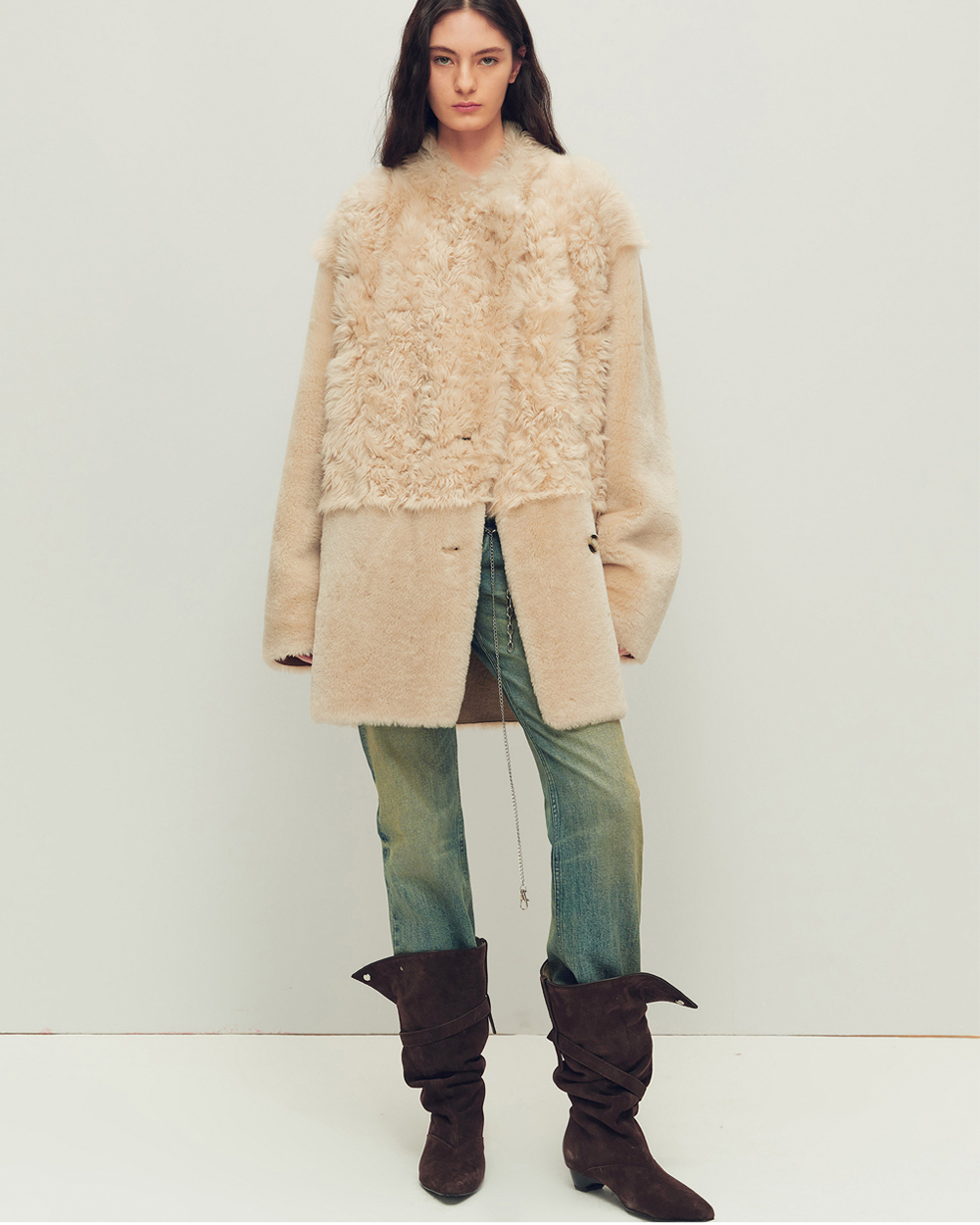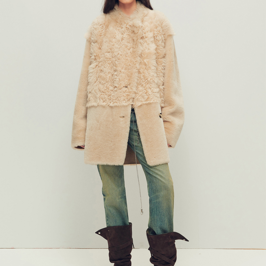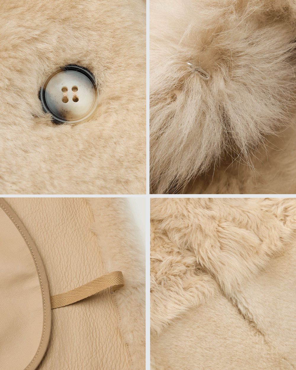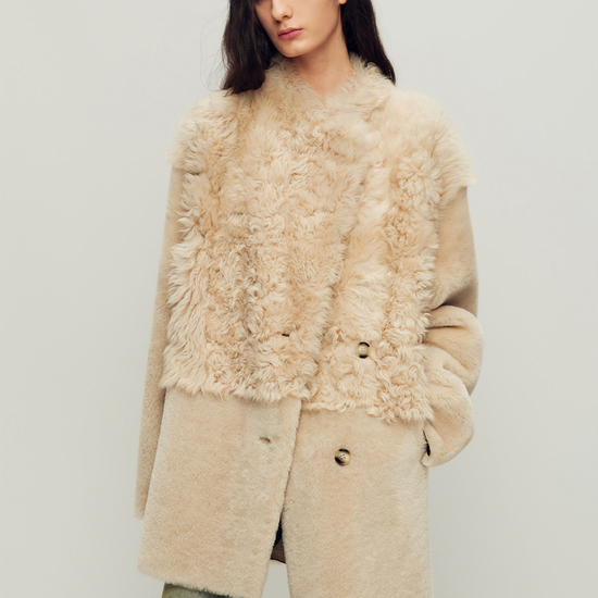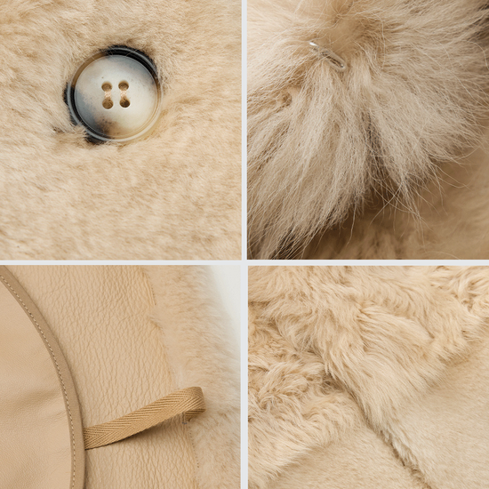 - Design Elements: Contrast patchwork of Toscana and Merino lamb fur, double-breasted design, natural ivory tone