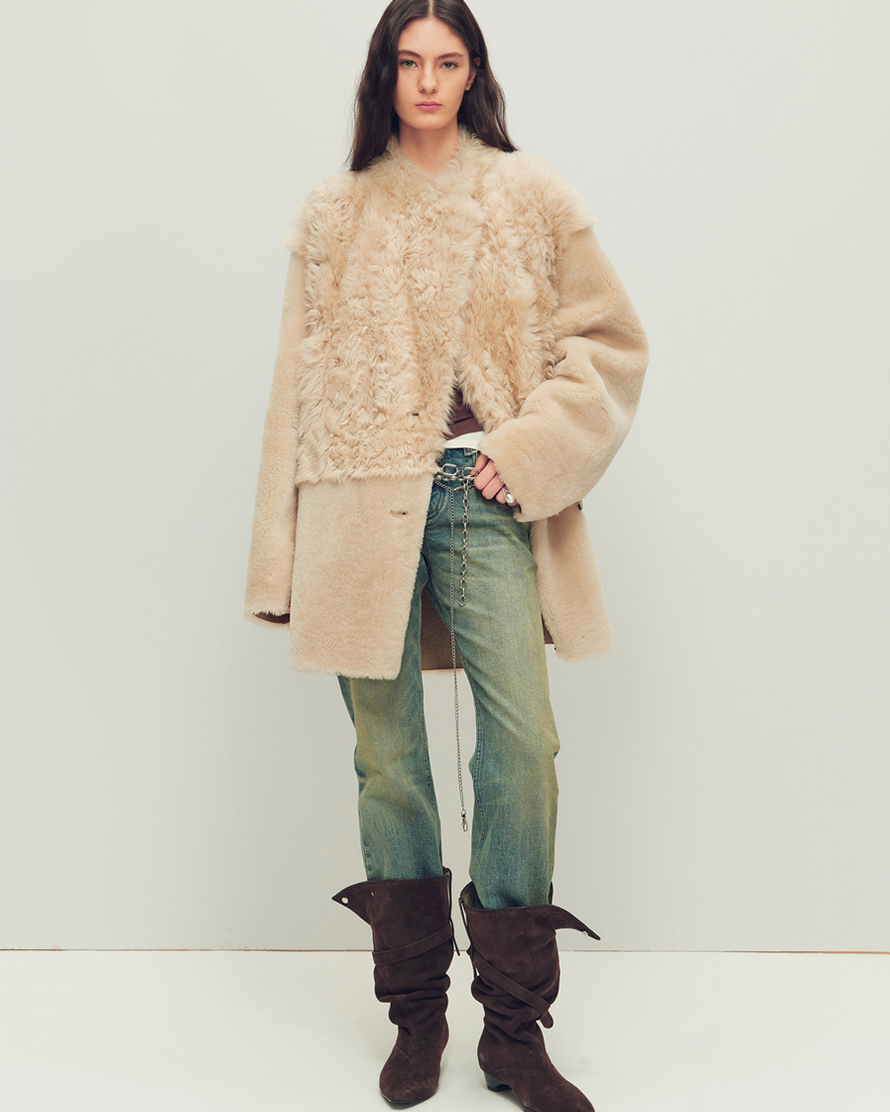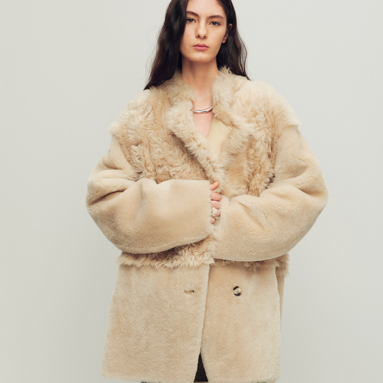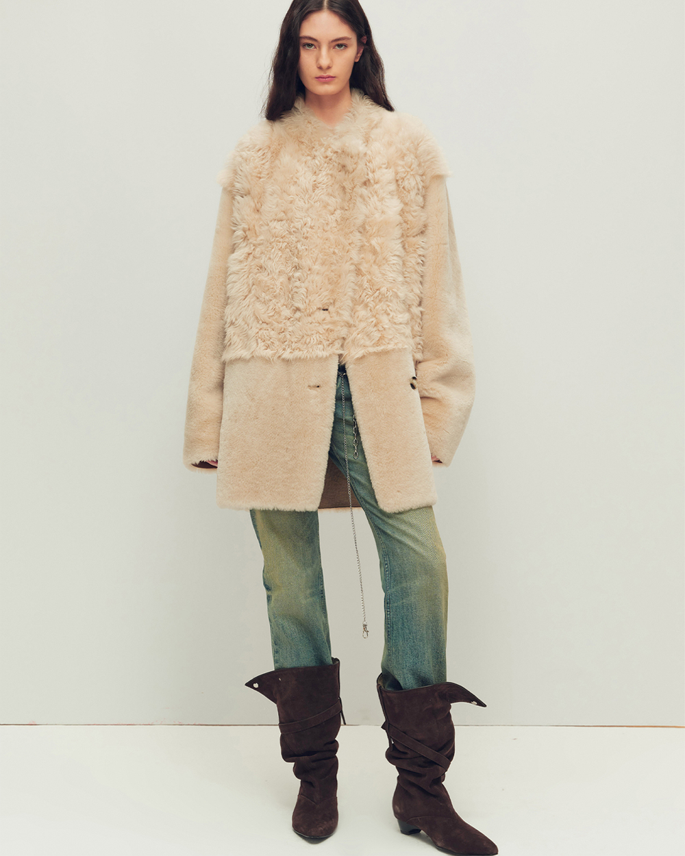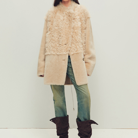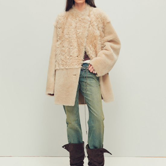 - Design Elements: Contrast patchwork of Toscana and Merino lamb fur, double-breasted design, natural ivory tone