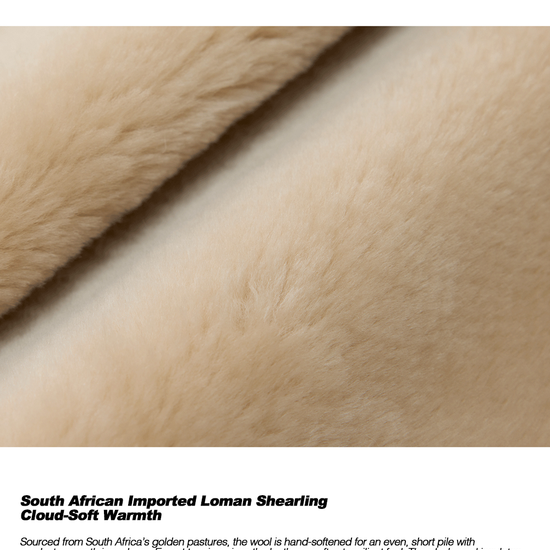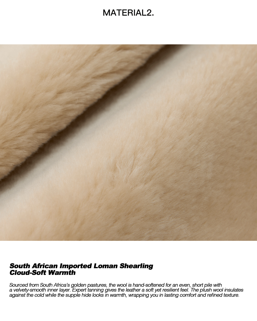 - Fabric Composition: Outer: South African Merino & Italian Toscana sheepskin; Trim: lamb leather; Details: woven tape, metal buckles, resin buttons