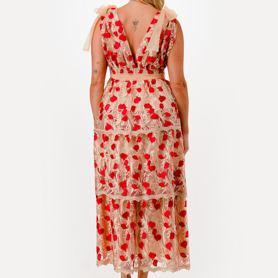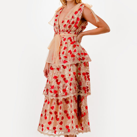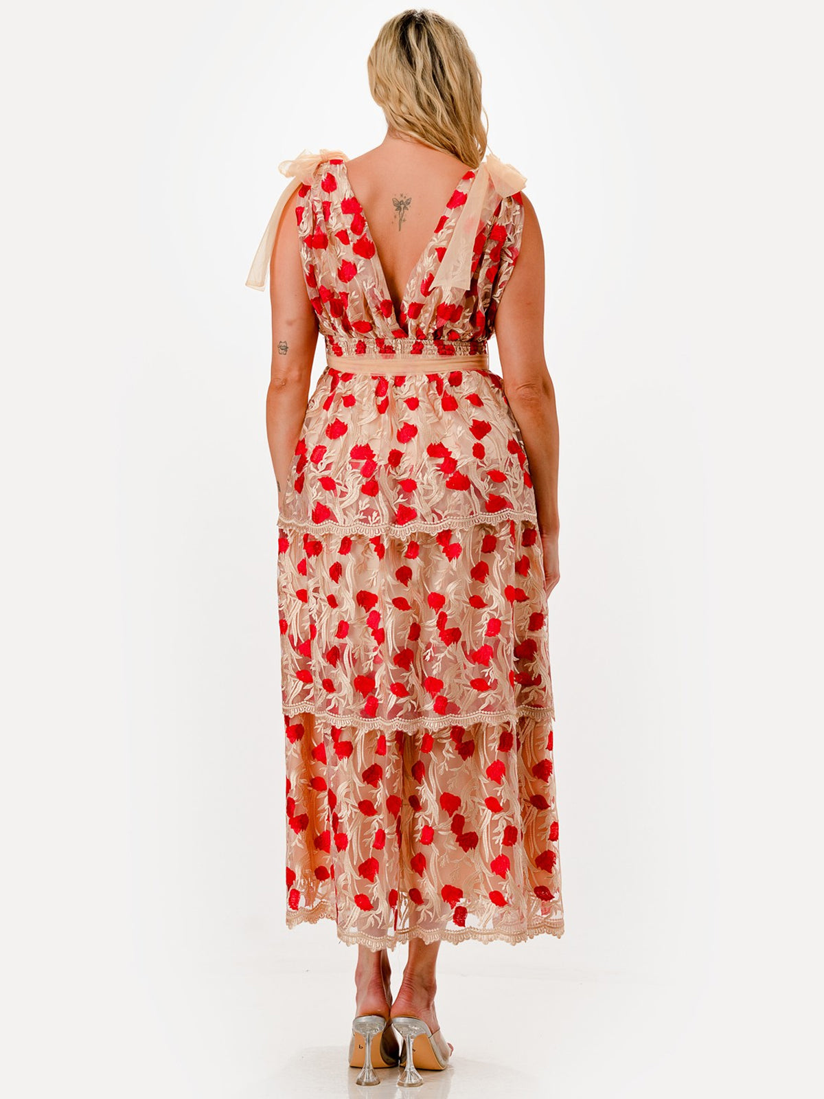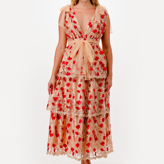 Romance is in the air with this enchanting midi dress. It features a layer of soft, sheer tulle beautifully embroidered with vibrant red florals that pop against the nude lining. The deep V-neckline is framed by whimsical sheer tulle bows at the shoulders, adding a fairy-tale touch. With a matching tulle sash to cinch the waist and a tiered skirt that floats as you walk, it’s the perfect choice for garden parties, summer weddings, or any day you want to feel extraordinary.