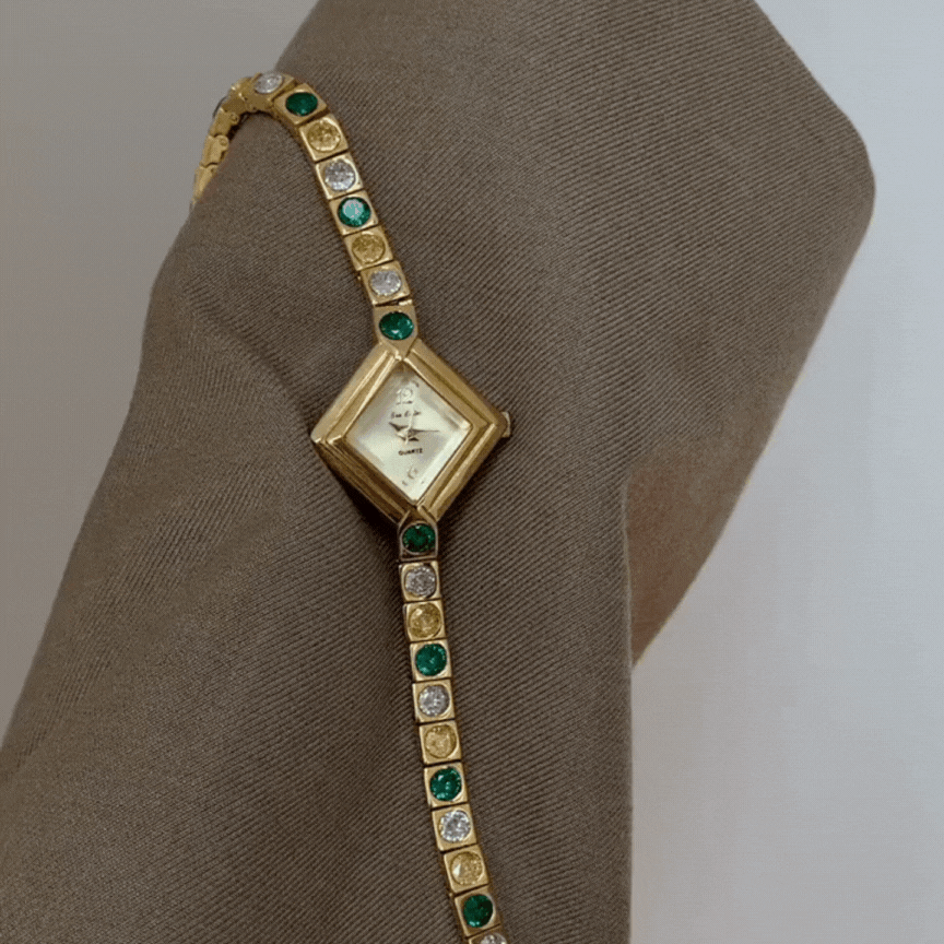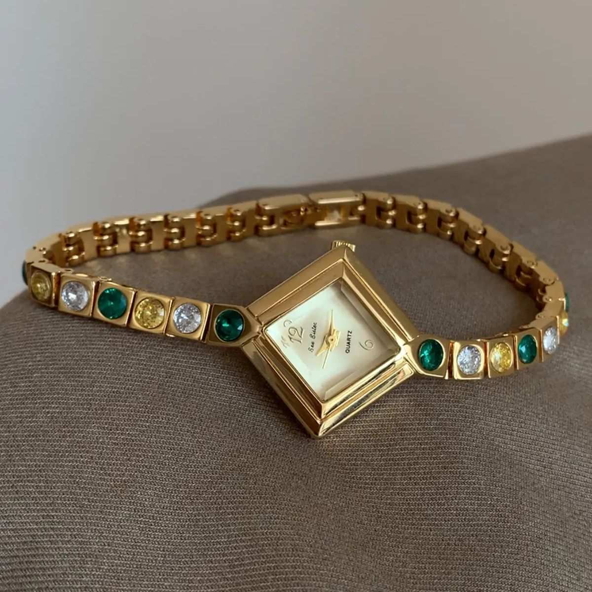 Este llamativo reloj de cuarzo cuenta con una pequeña esfera en forma de rombo En un sorprendente combinación de colores dorado y verde, acentuado con cristales brillantes Para un toque de glamour. Con movimiento de cuarzo preciso y una silueta única y elegante, es el accesorio perfecto para un estilo destacado con un encanto refinado.