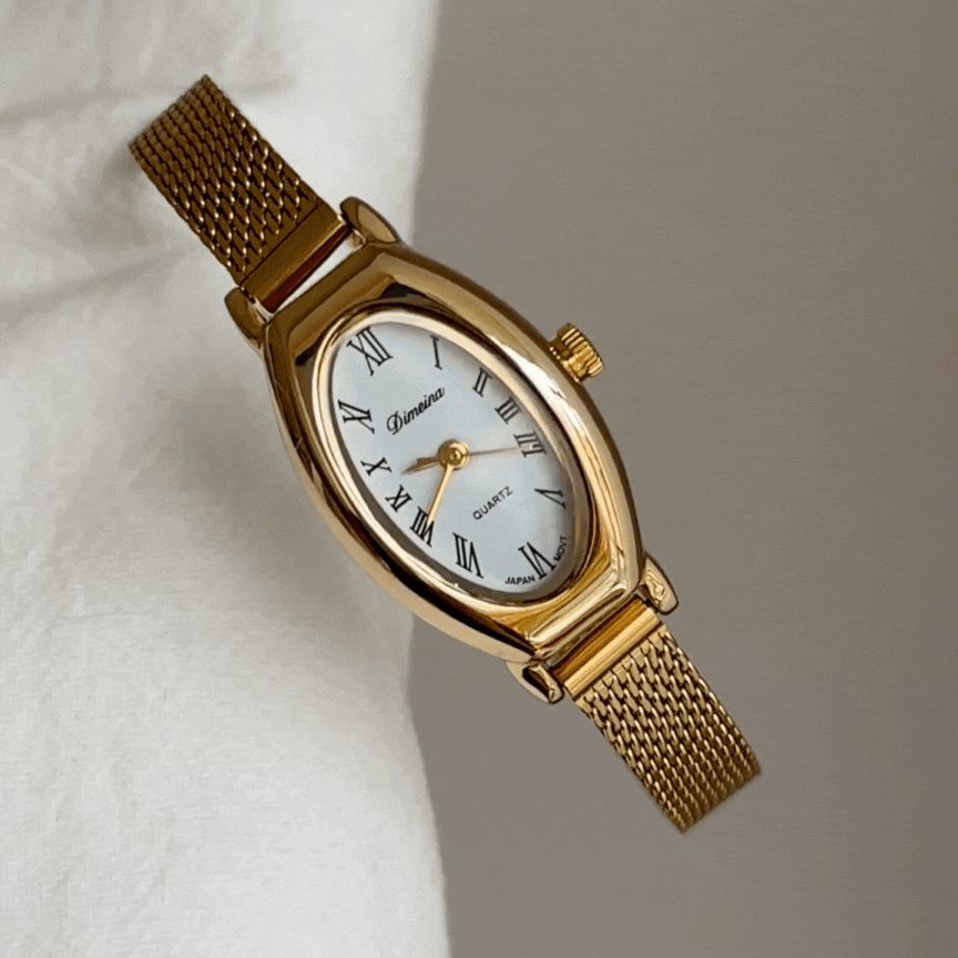 Elegant women’s quartz watch with a gold mesh strap, oval case, and white dial, blending vintage charm with refined delicate style.