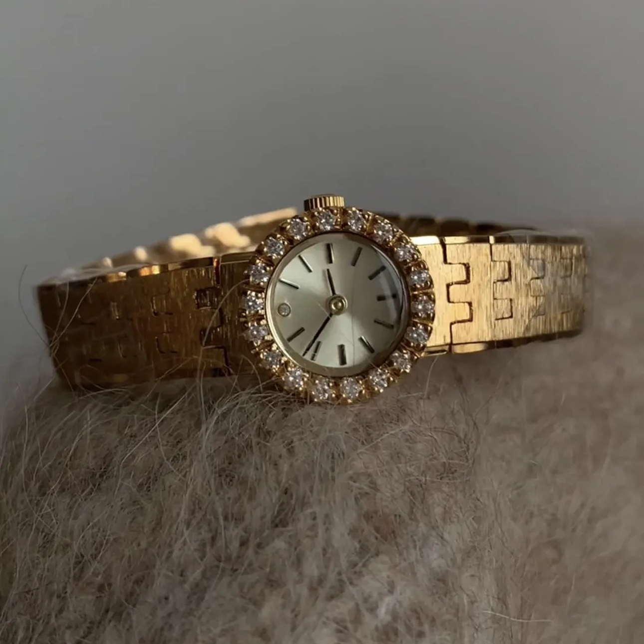 Presentando el Reloj Golden SparkleUna impresionante combinación de elegancia y sofisticación. Elaborado con un brillante acabado dorado y adornado con brillantes diamantes, este reloj cuenta con una mini esfera de cuarzo alojada en una refinada caja de latón. Su delicado diseño irradia lujo atemporal, lo que lo convierte en el accesorio perfecto para cualquier ocasión. Ya sea para una salida nocturna o para añadir un toque de glamour a tu look diario, este reloj encarna una opulencia discreta y una artesanía excepcional.