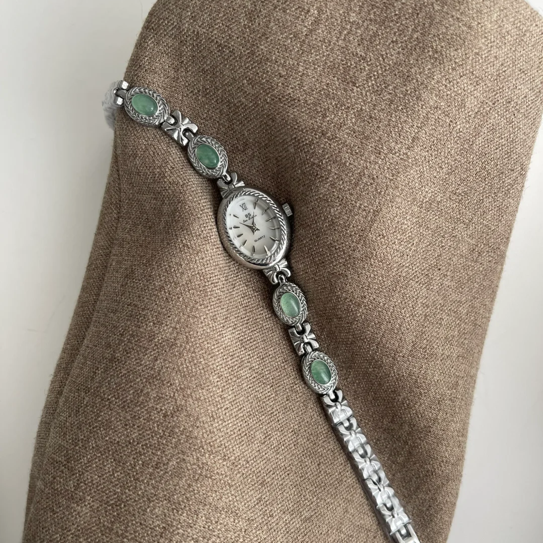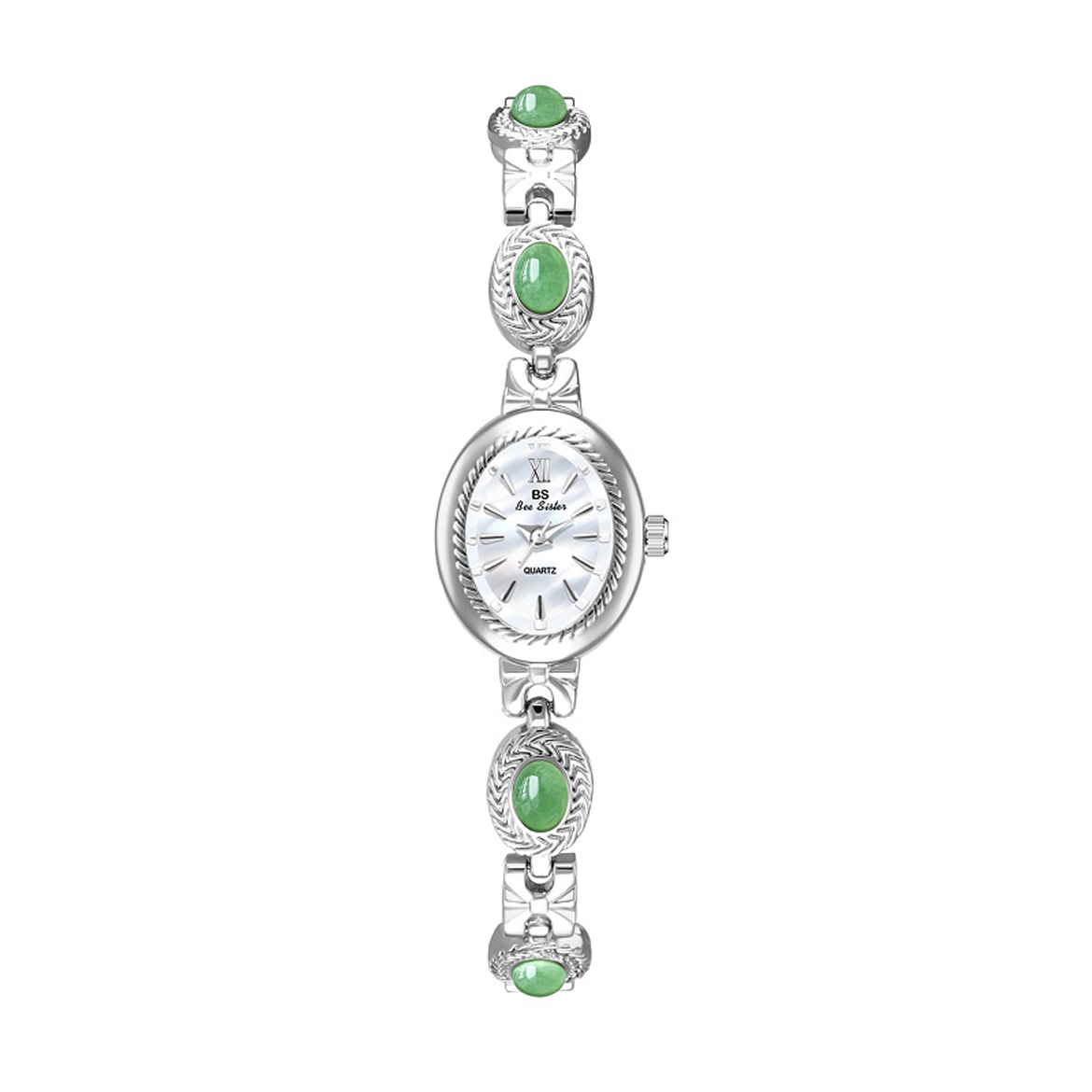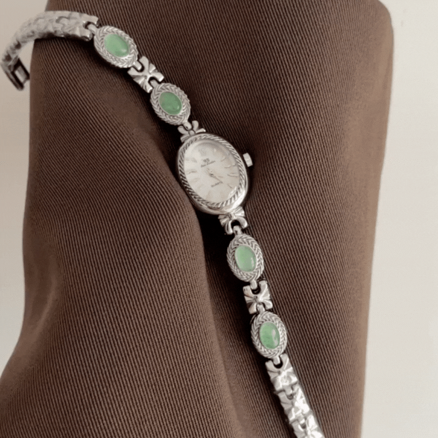 Green Jade Inlay Classic Silver Bracelet Ladies Quartz Reloj