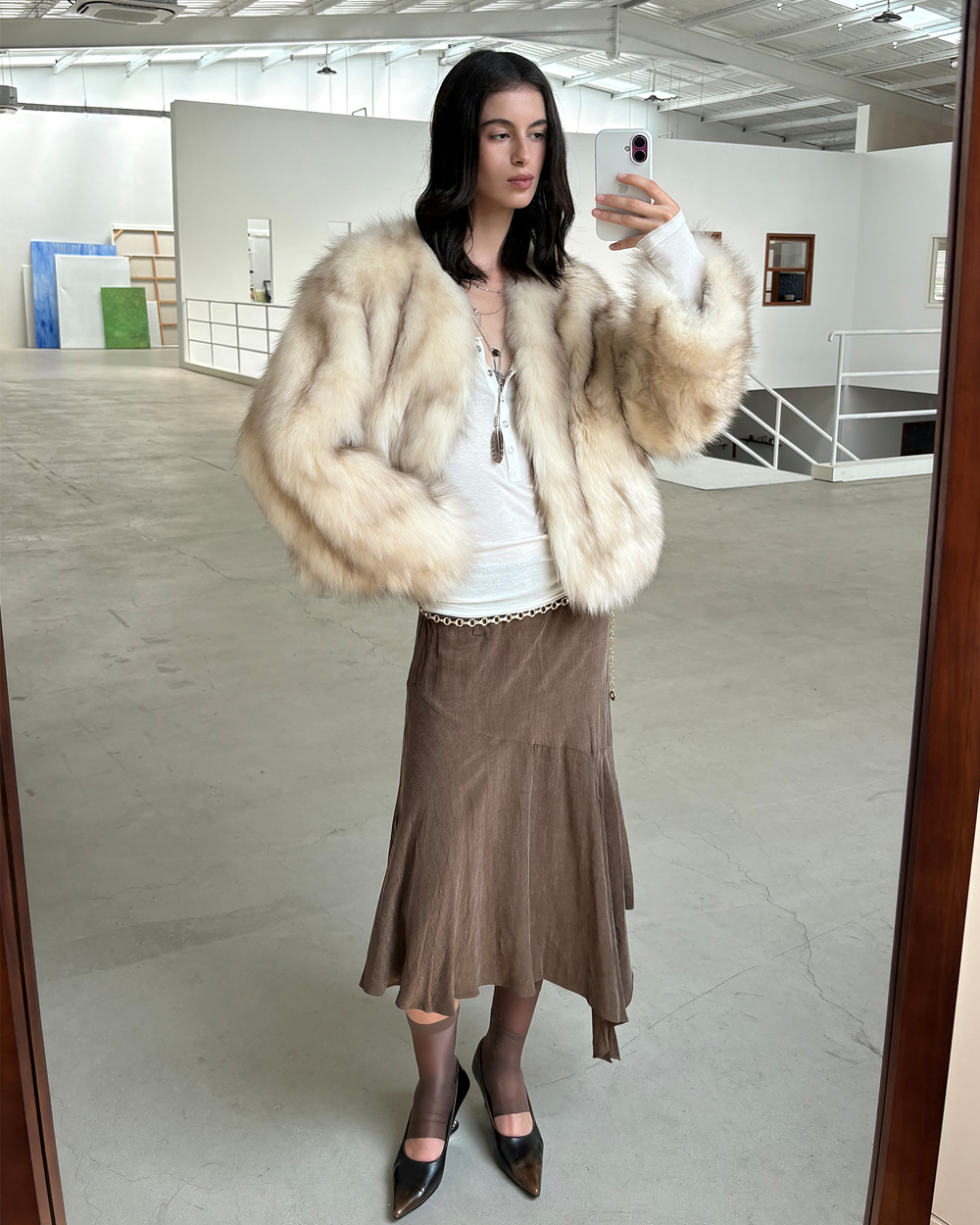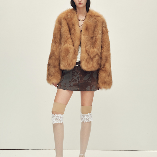 - Design Elements: Hand-dyed natural fox fur, V-neck silhouette, leather trim details