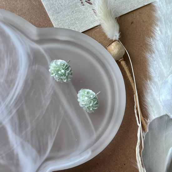 Fall in love with delicate craftsmanship and soft tones with these original handmade floral earrings in pastel green hues. Each pair is an artistic creation, meticulously crafted stitch by stitch with premium imported materials: