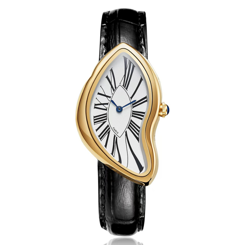 This high-end women’s quartz watch features a creative melted gold-tone case, a clean white dial, and a black genuine leather strap. The sculptural, twisted design adds an artistic edge while maintaining a refined, elegant silhouette. Finished with a reliable quartz movement, it’s a statement piece for women who appreciate modern fashion and unique design.