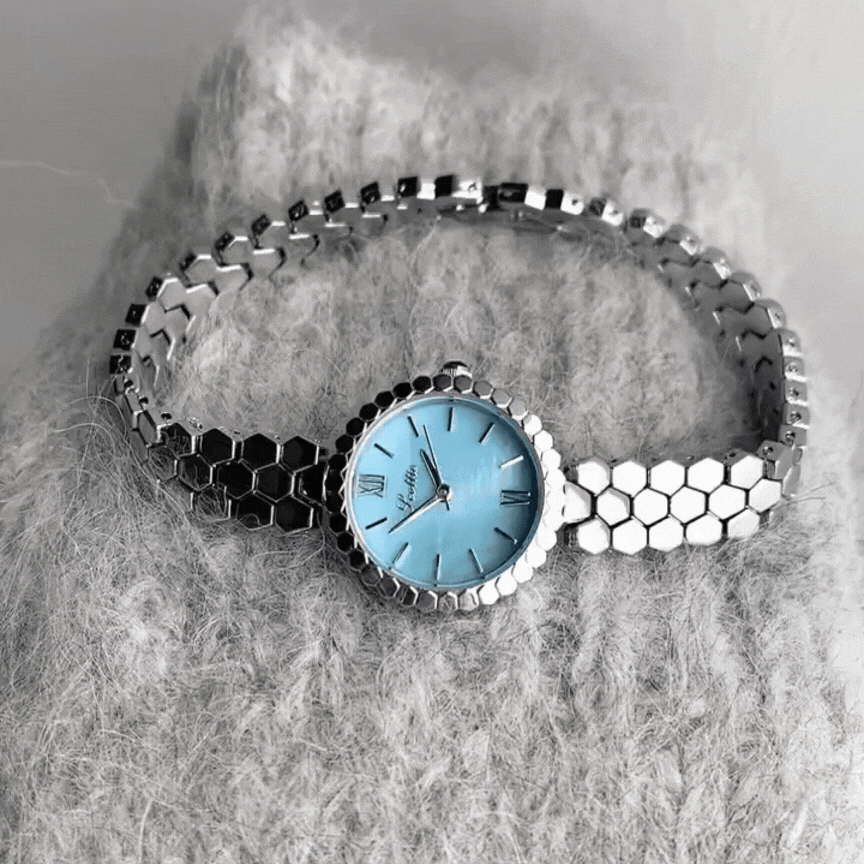 Una combinación de un intrincado diseño de cadena de panal y una impresionante esfera de nácar azul, este reloj irradia elegancia y sofisticación. Perfecto para añadir un toque de lujo refinado a cualquier look.