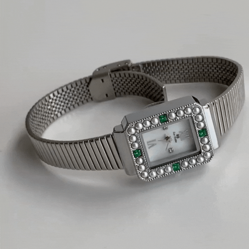 Este refinado reloj de cuarzo para mujer combina un esfera rectangular blanca con un único Pulsera de eslabones de bambú de plata y un bisel delicadamente engastado con piedras verde perlaEl contraste de la plata de tonos fríos y los suaves matices de las piedras preciosas crea una elegancia discreta, perfecta para los amantes de la belleza tranquila y el estilo refinado.