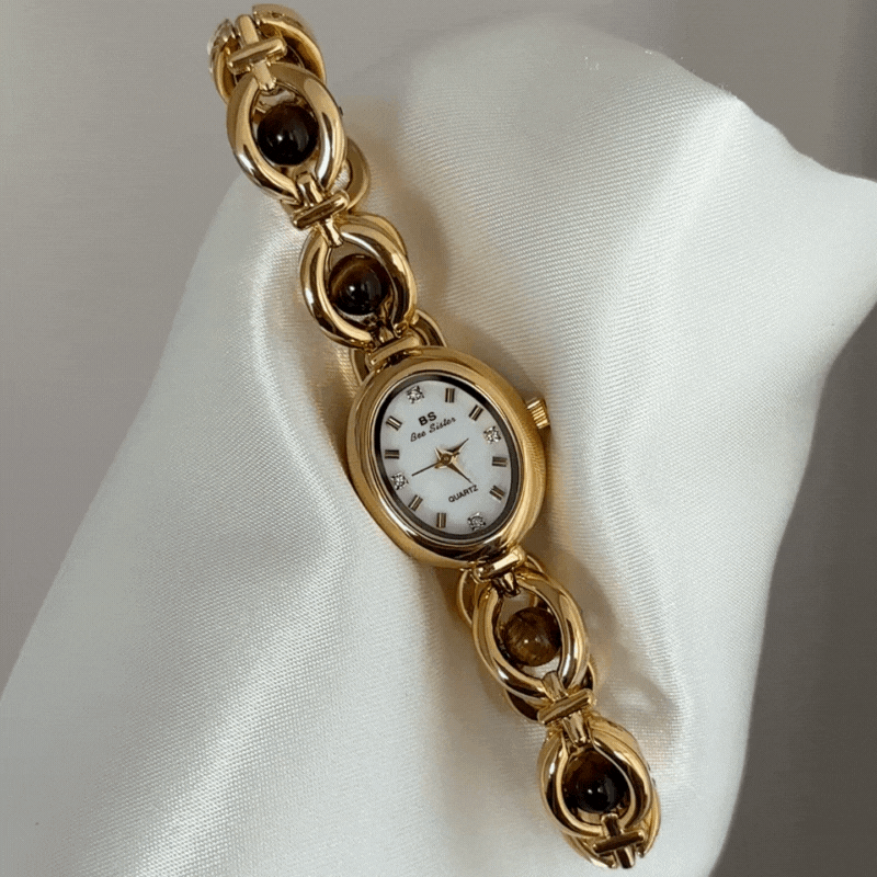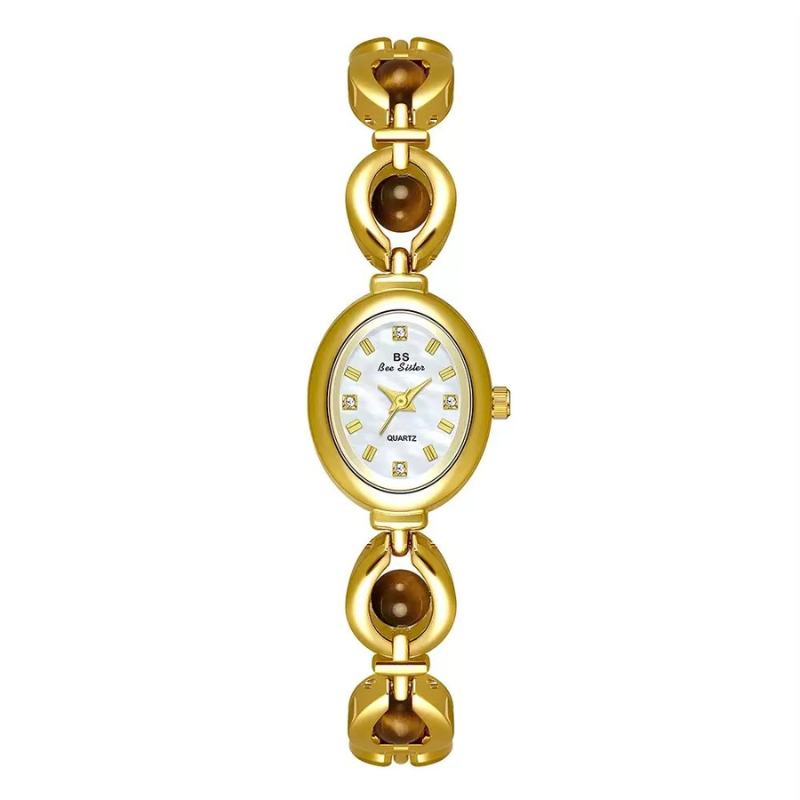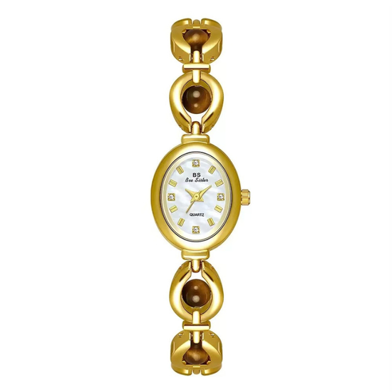Light Luxury Art White Oval Tiger's Eye Bracelet Watch – Gold Quartz Timepiece