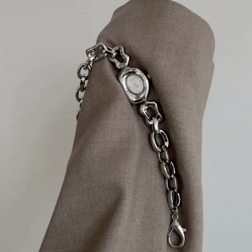 Delicadamente audaz, este reloj de cuarzo para mujer combina elegancia natural con arte moderno. Un luminoso esfera de nácar blanco capta la luz con cada movimiento, mientras que la Pulsera de cadena de plata escultural envuelve la muñeca con silenciosa sofisticación.