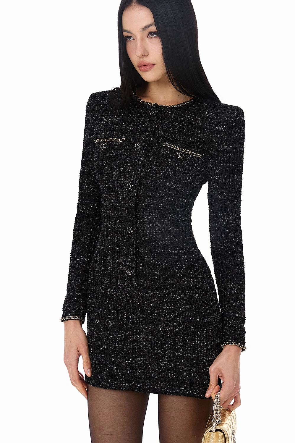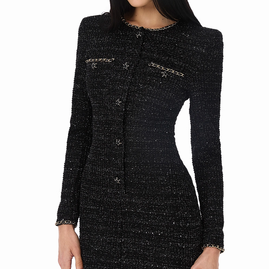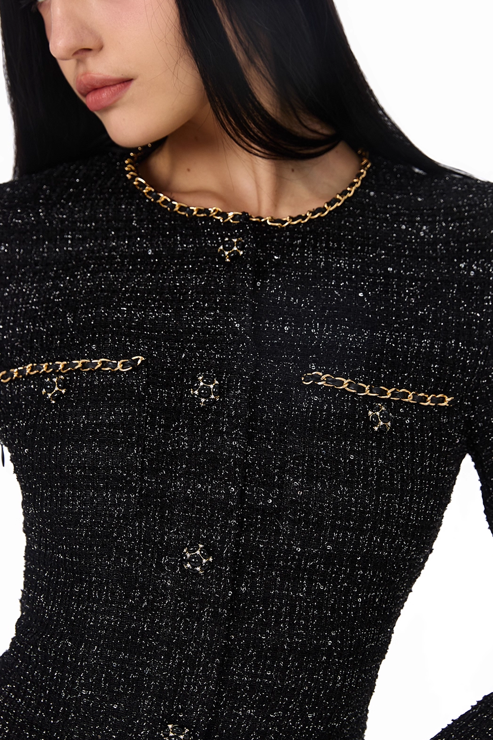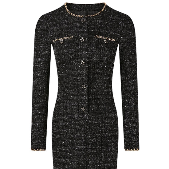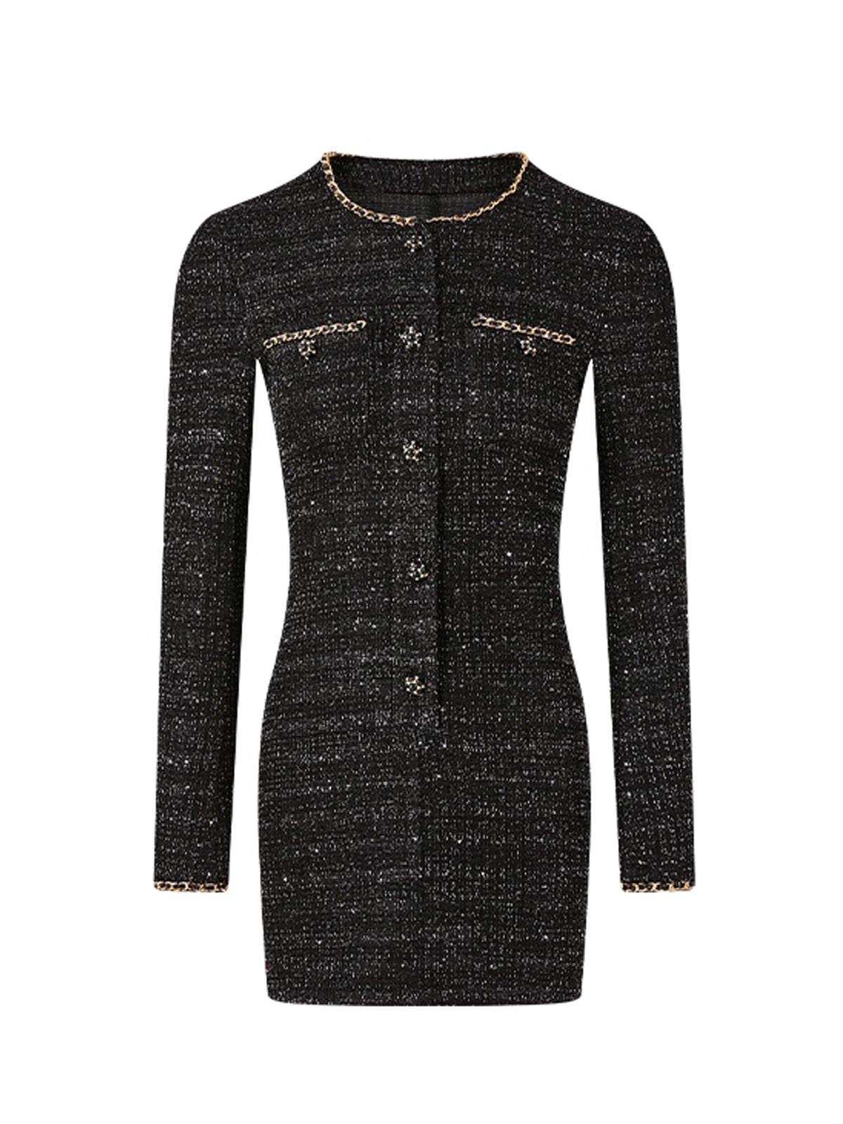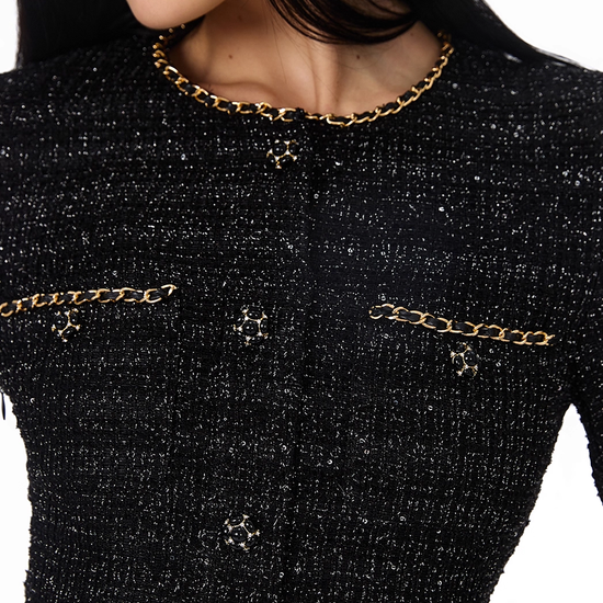 Command the room in this Luxury Tweed Mini Dress. Woven with shimmering lurex for a subtle "starlit" glow, this piece defines modern elegance. It features structured shoulder pads for a sharp, confident silhouette and is finished with exquisite gold-chain contrast trim. Perfectly suited for cocktail parties and evening events, this slim-fit dress offers a sophisticated look with comfortable stretch.
