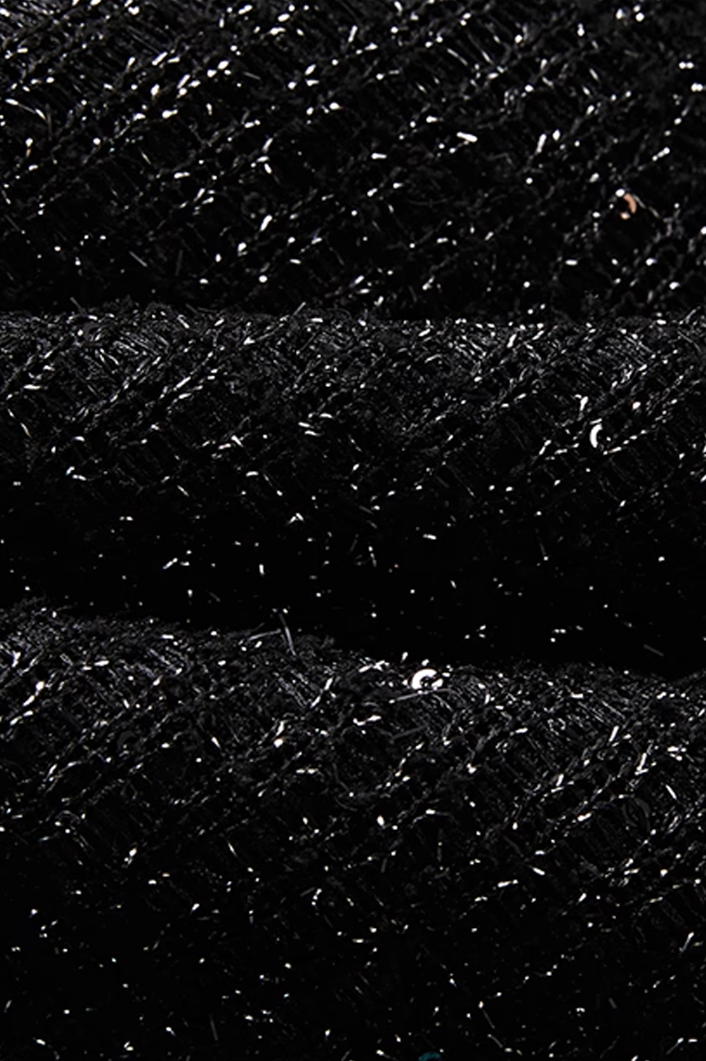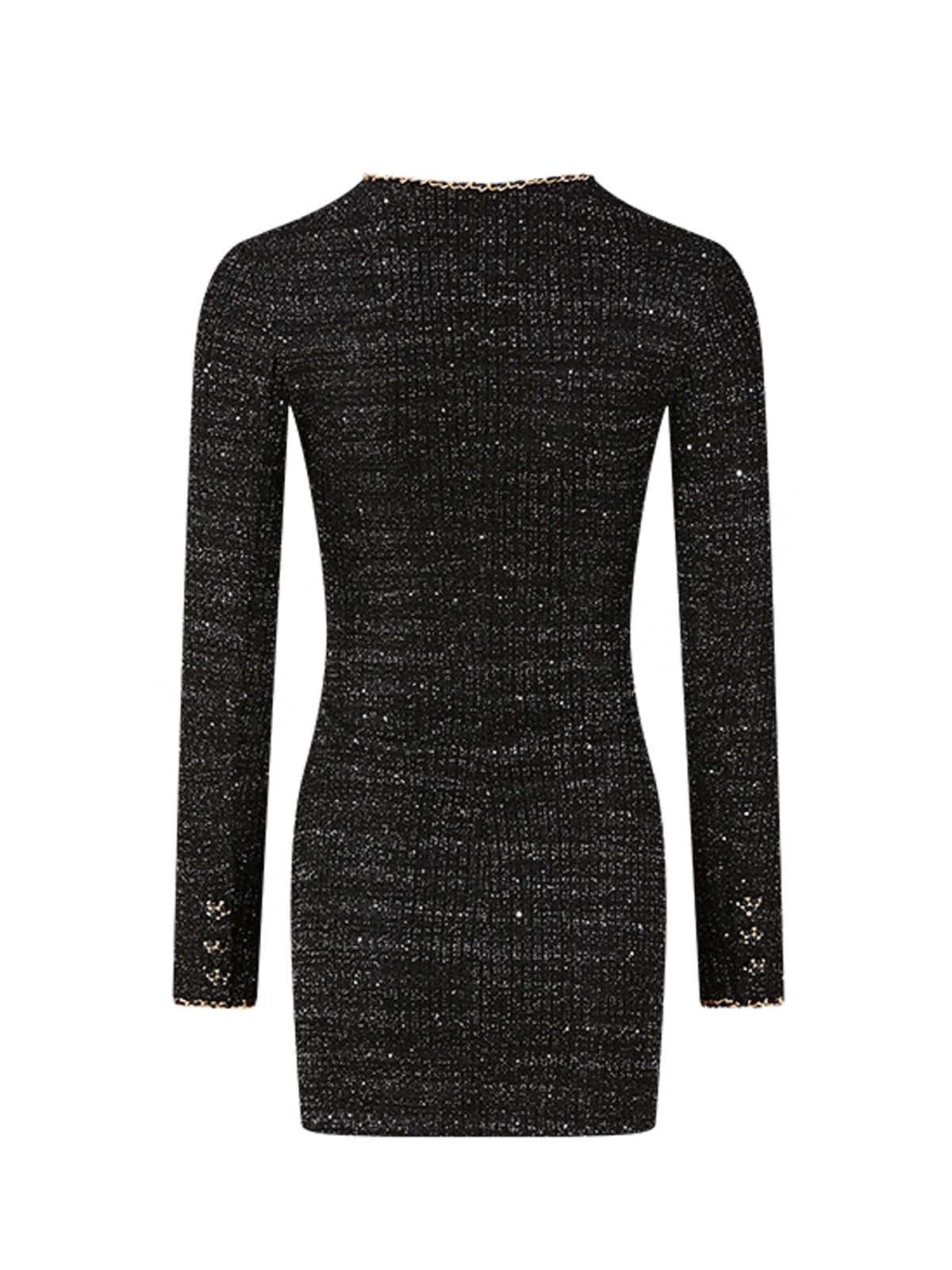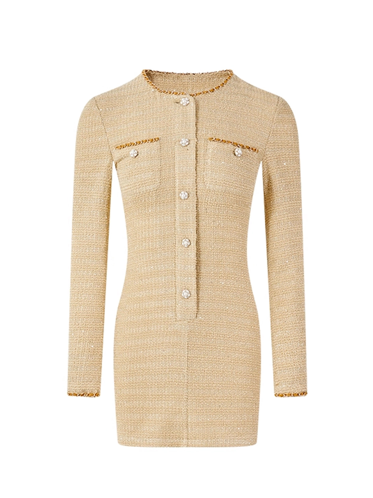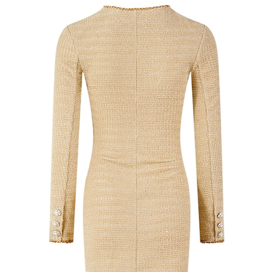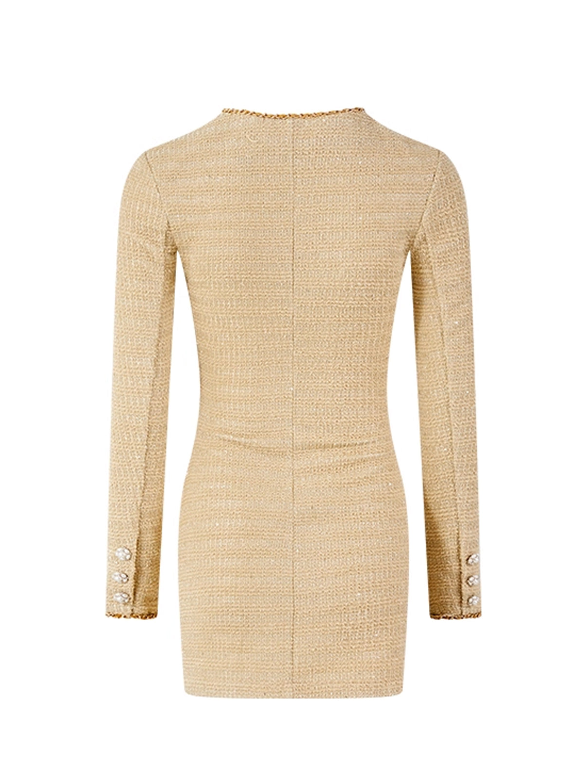 Command the room in this Luxury Tweed Mini Dress. Woven with shimmering lurex for a subtle "starlit" glow, this piece defines modern elegance. It features structured shoulder pads for a sharp, confident silhouette and is finished with exquisite gold-chain contrast trim. Perfectly suited for cocktail parties and evening events, this slim-fit dress offers a sophisticated look with comfortable stretch.