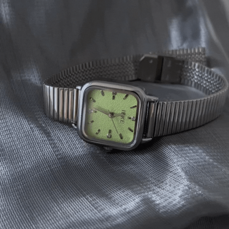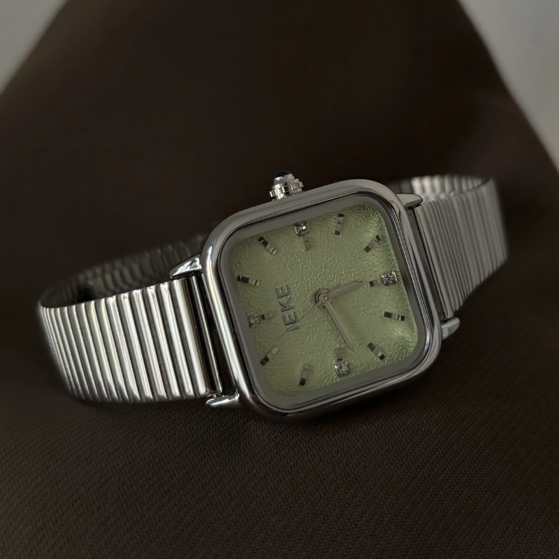 Este reloj de cuarzo para mujer combina un esfera cuadrada verde menta con un único Pulsera de eslabones de bambú de plata, que combina el minimalismo moderno con un sutil juego de colores. Su diseño resistente al agua Lo hace no sólo hermoso sino también práctico para el uso diario.