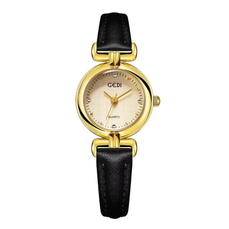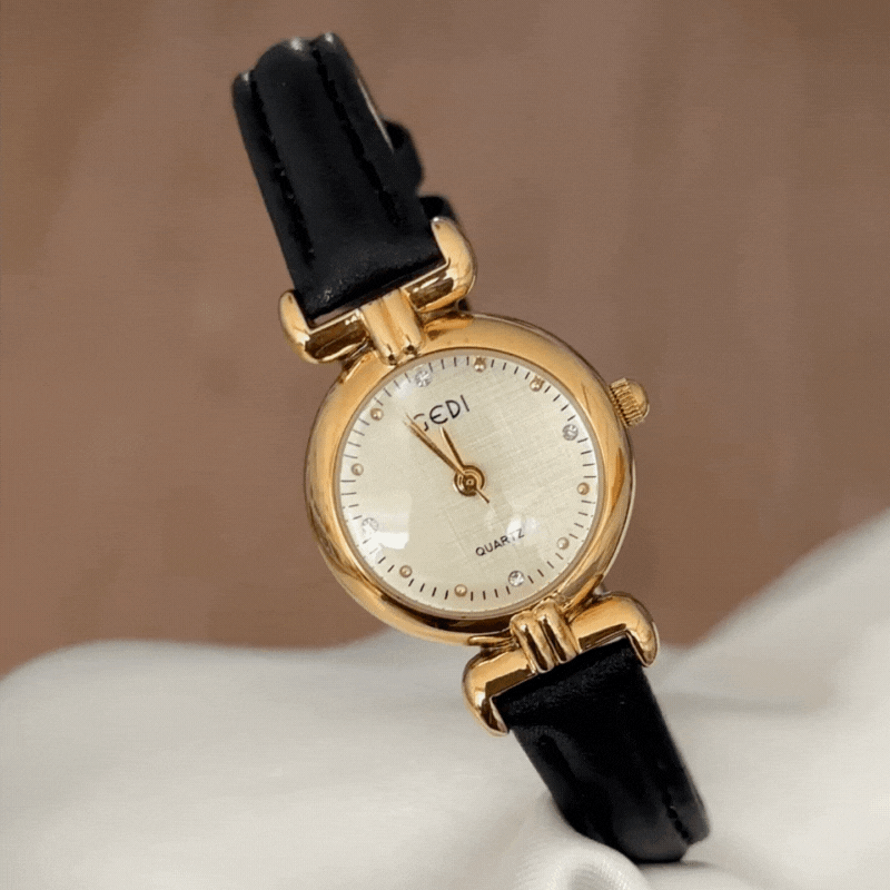 Discover refined modernity with this minimalist gold timepiece. The elegant gold face presents a streamlined aesthetic that embodies contemporary luxury, set within a precisely crafted gold case with polished edges. Combined with a adaptable black leather band, the watch establishes a compelling tonal contrast that defines urban refinement.