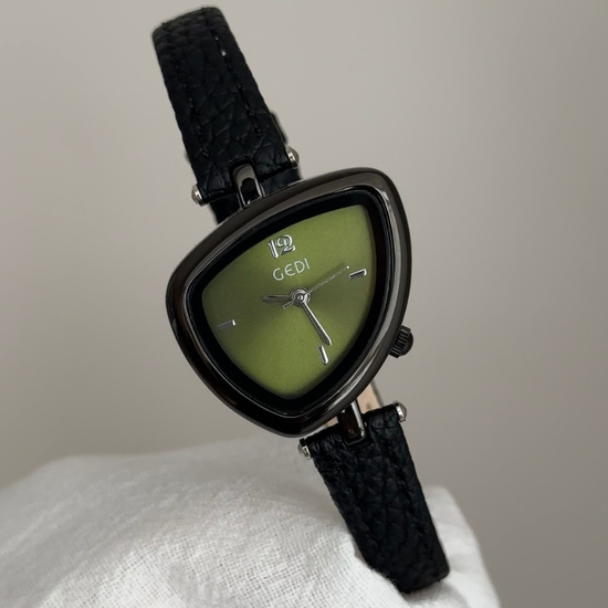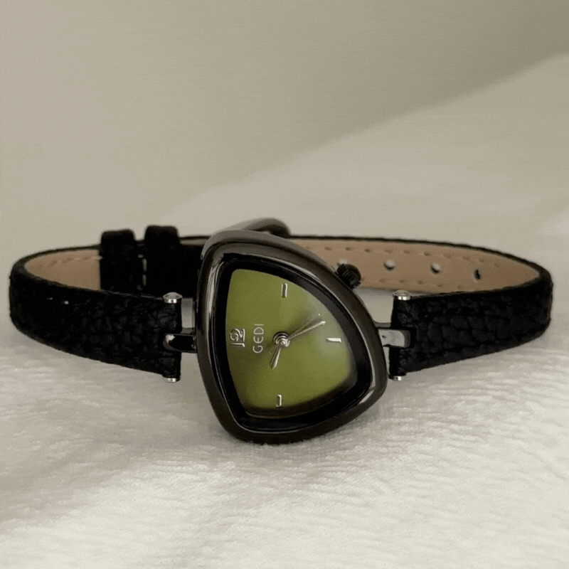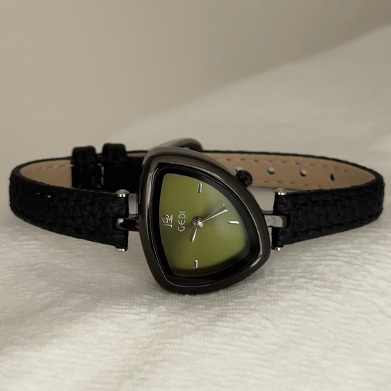 Elevate your style with this stylish watch featuring a unique green teardrop-shaped dial in a sleek black case, paired with a classic black Microfiber Leather strap. This artistic design combines bold geometry with timeless elegance, perfect for both casual and formal wear.
