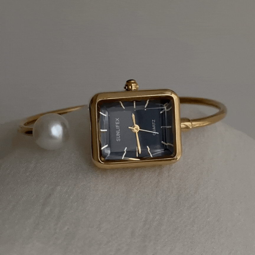 Este reloj de cuarzo para mujer presenta un llamativo Esfera cuadrada negra y dorada, enmarcado en un elegante Pulsera estilo brazalete delicadamente incrustada con perlasEl contraste de tonos profundos y brillantes acentos de perlas le dan a esta pieza un toque refinado pero moderno.