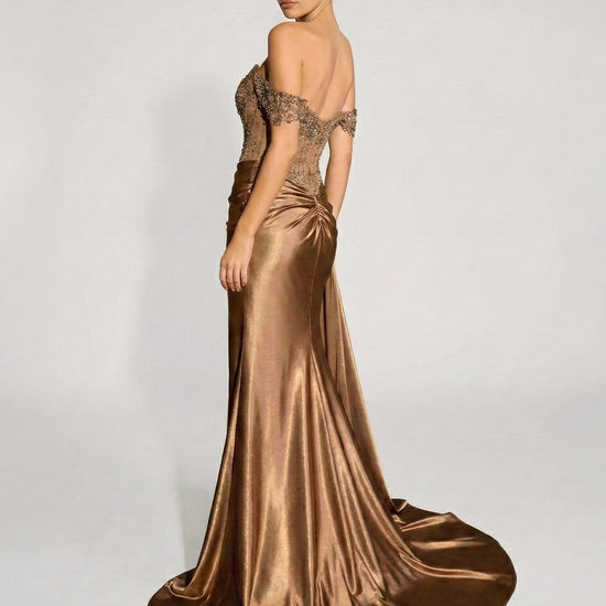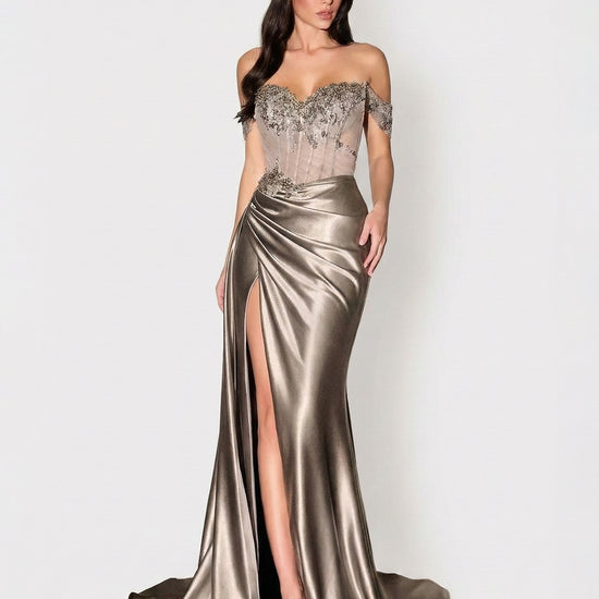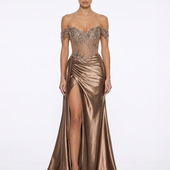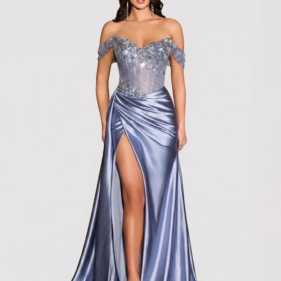 Off-Shoulder Beaded Corset Satin Gown High Slit Maxi Dress
