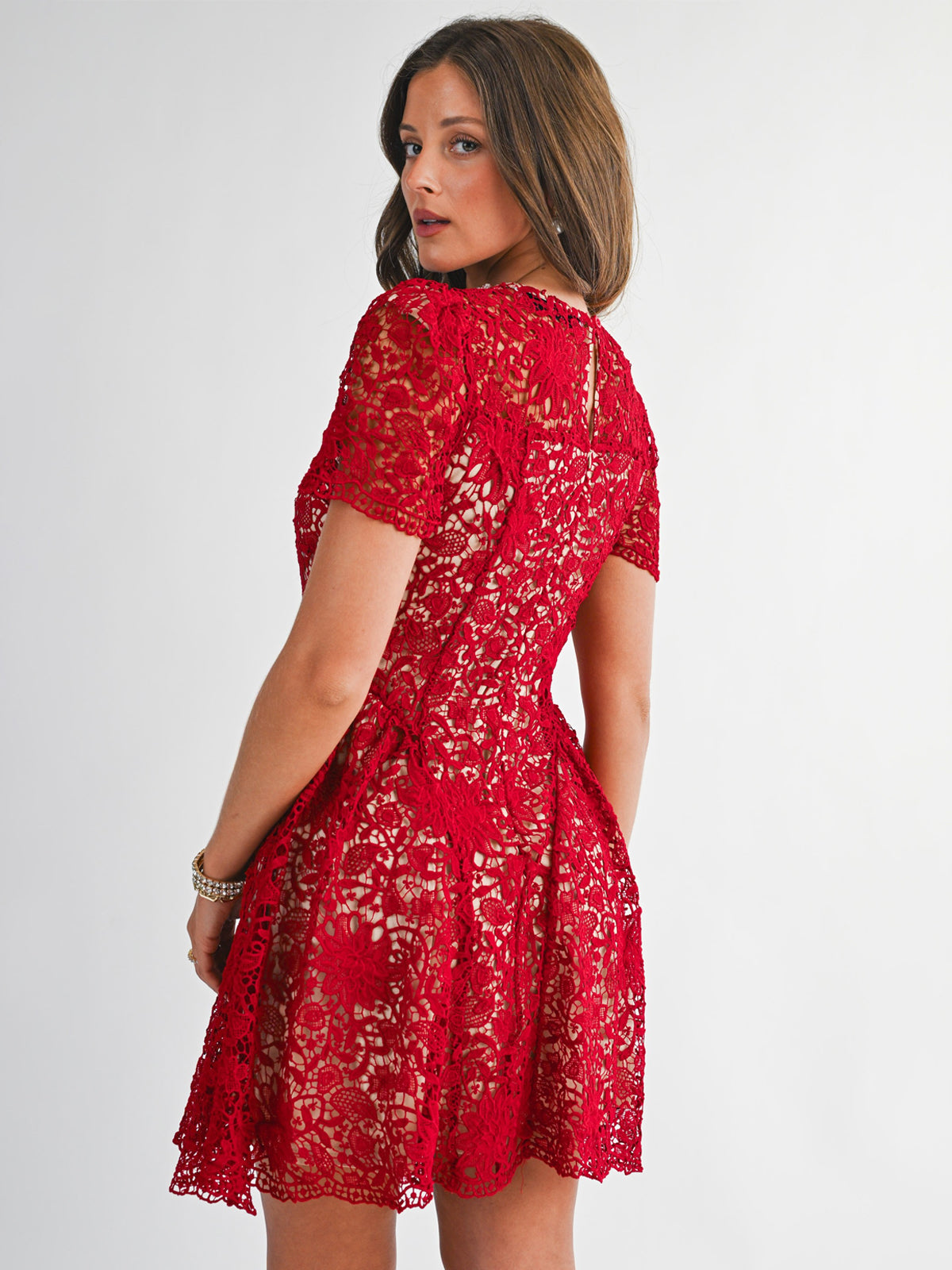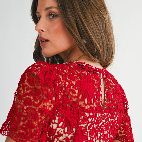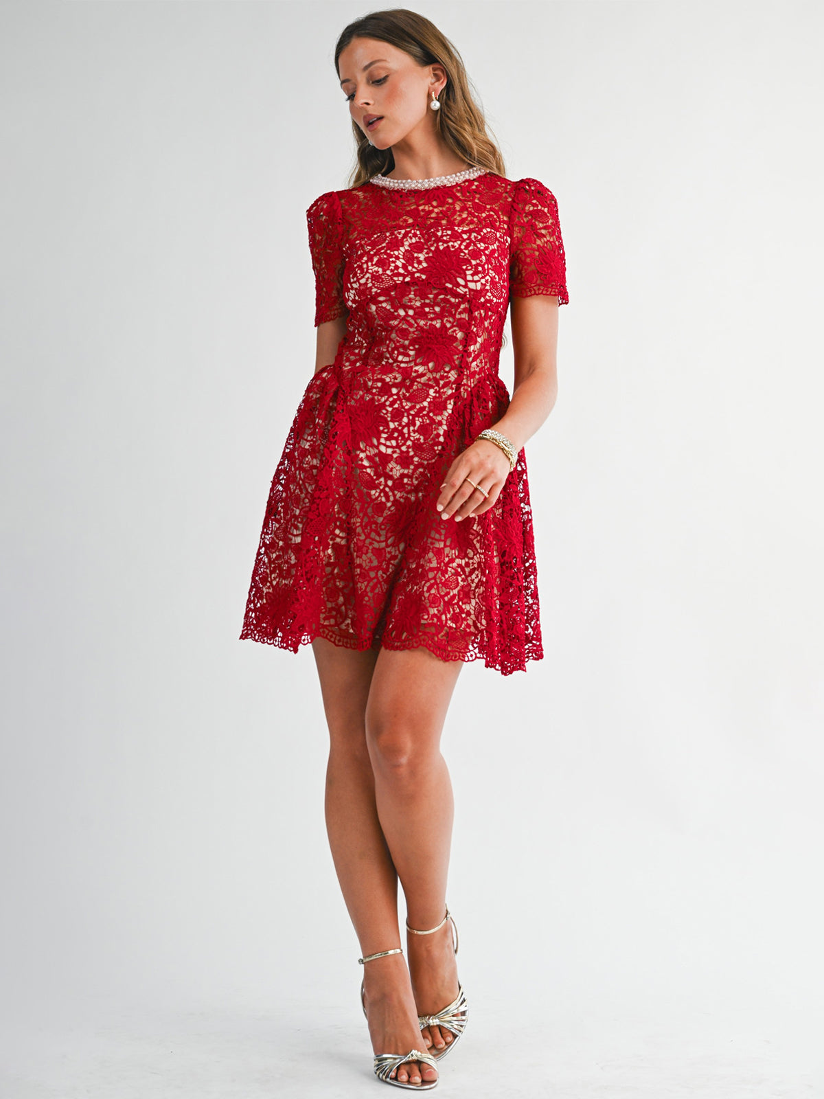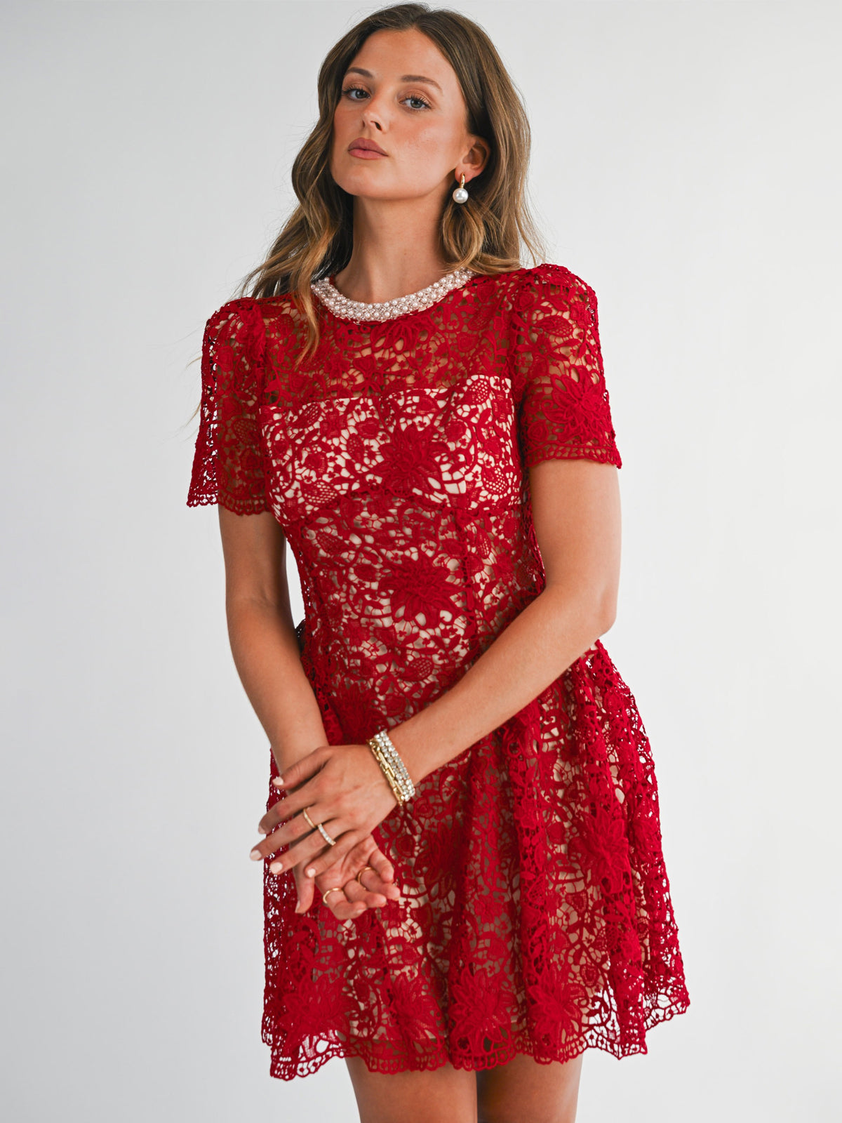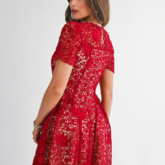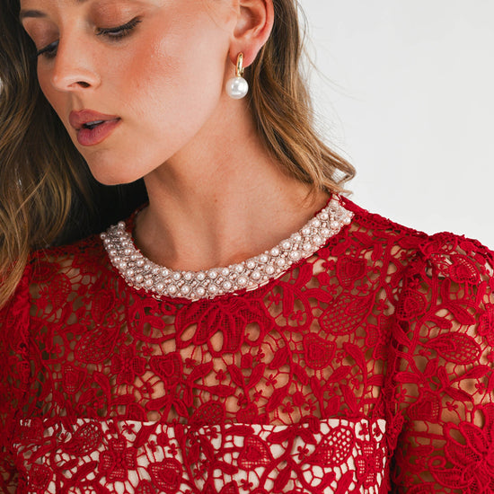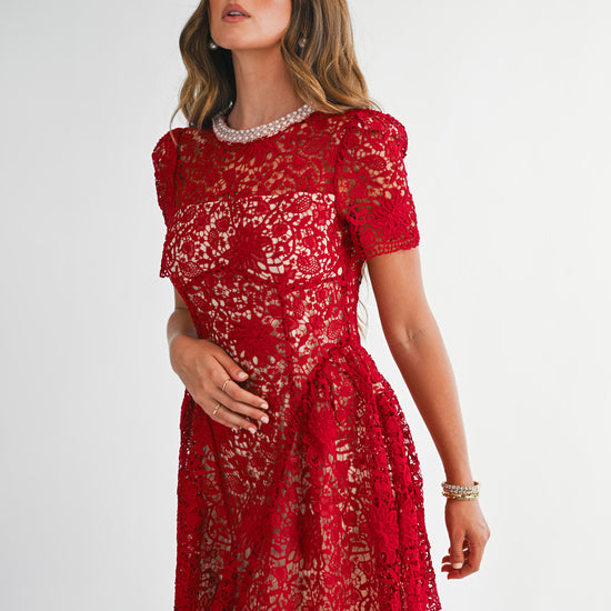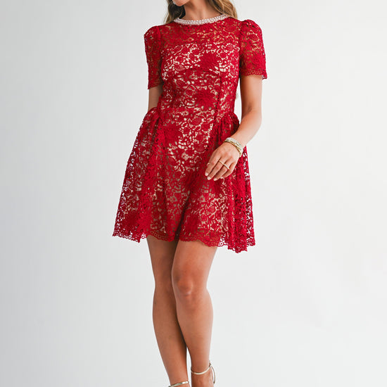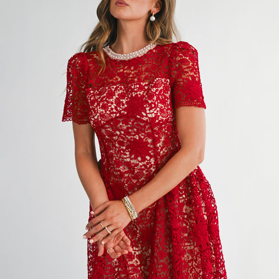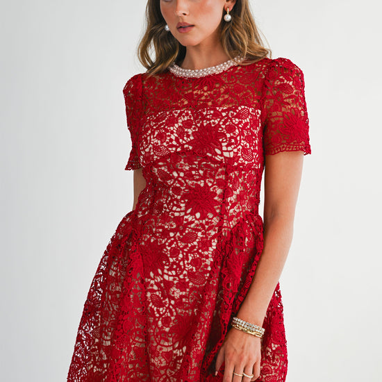Step into elegance with this sophisticated and timeless design. This intricate piece features an all-over floral lace overlay that adds rich texture and a feminine touch. The highlight is the stunning high neckline, beautifully adorned with pearls for a built-in accessory look. Cut in a flattering silhouette with short sleeves and a tiered flared skirt, it provides a classic aesthetic that transitions perfectly from afternoon tea to evening events. A simple keyhole detail with a button closure at the back ensures a refined finish.