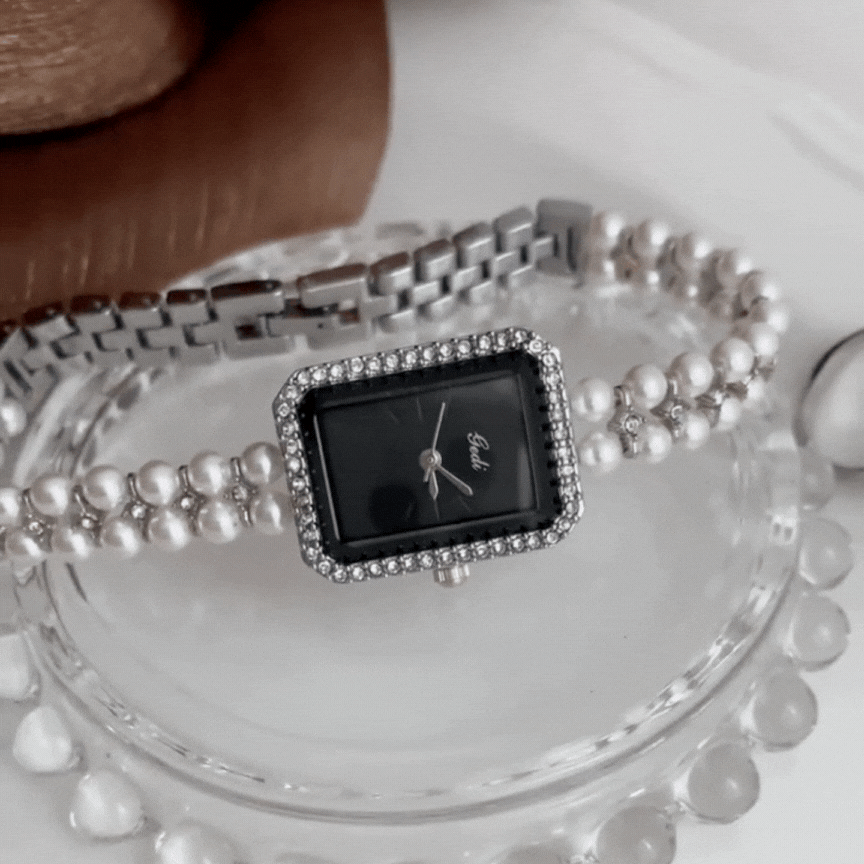 Reloj de pulsera de perlas modernas - cuarzo negro plateado con cristales