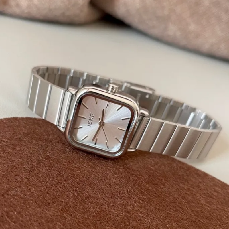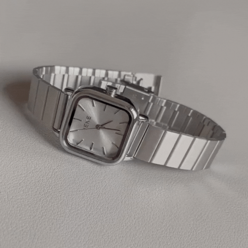 Este reloj de cuarzo para mujer cuenta con una esfera cuadrada plateada emparejado con un elegante pulsera de eslabones de bambúTodo con un acabado monocromático en tonos fríos. Con sus líneas limpias y texturas sutiles, es una expresión discreta de sofisticación moderna, perfecta para quienes aprecian la forma, la función y la claridad.
