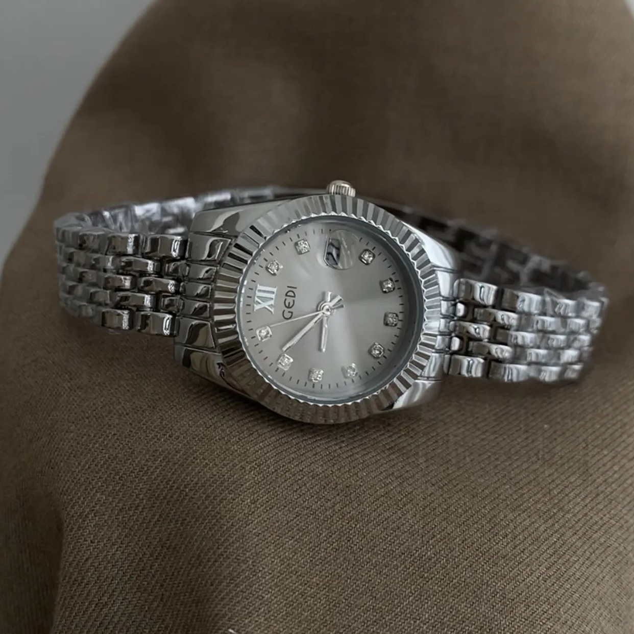 Presentamos el reloj Platinum Grace, símbolo de lujo refinado y sofisticación. Con un elegante brazalete de cadena plateado y una esfera gris pulida con calendario incorporado, este exquisito reloj combina practicidad con elegancia atemporal. Perfectamente diseñado para cualquier ocasión, es la combinación perfecta de estilo y funcionalidad.