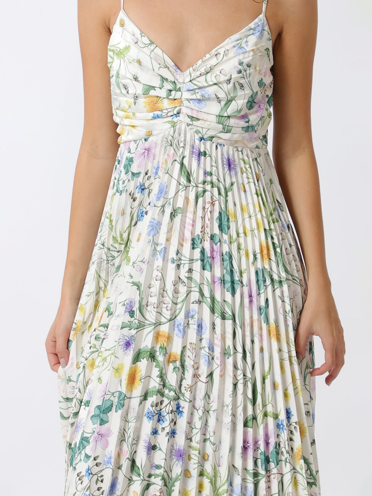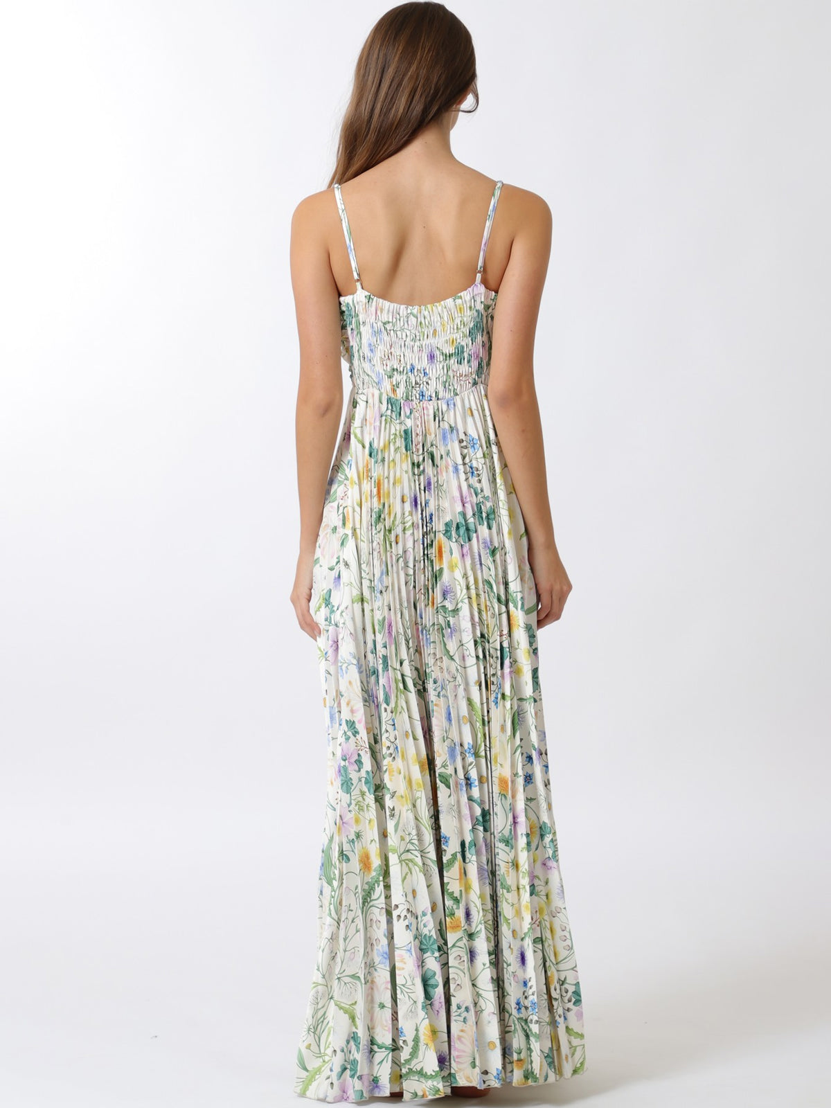 Pleated Wildflower Print Twist-Front Spaghetti Strap Maxi Dress