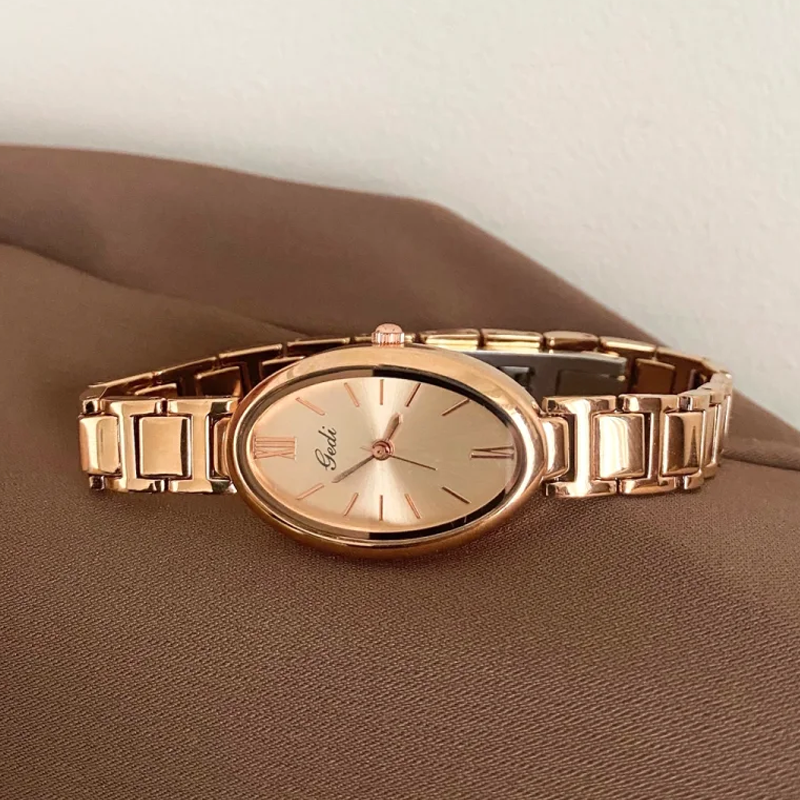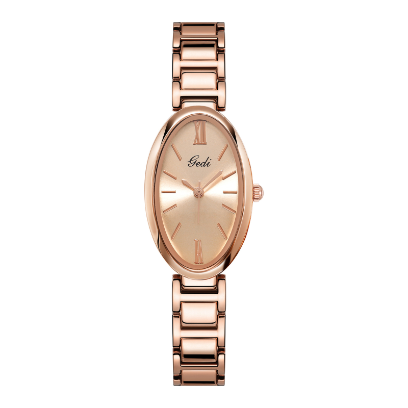 Presentando el Reloj ovalado ruborizadoUna armoniosa combinación de elegancia y diseño moderno. Con una elegante esfera ovalada y un brazalete de acero en oro rosa, este reloj irradia calidez y sofisticación. Su estética atemporal lo convierte en un accesorio versátil, perfecto tanto para ocasiones informales como formales.