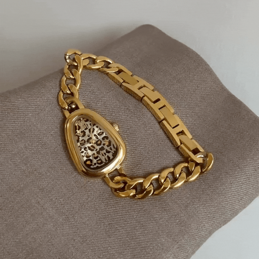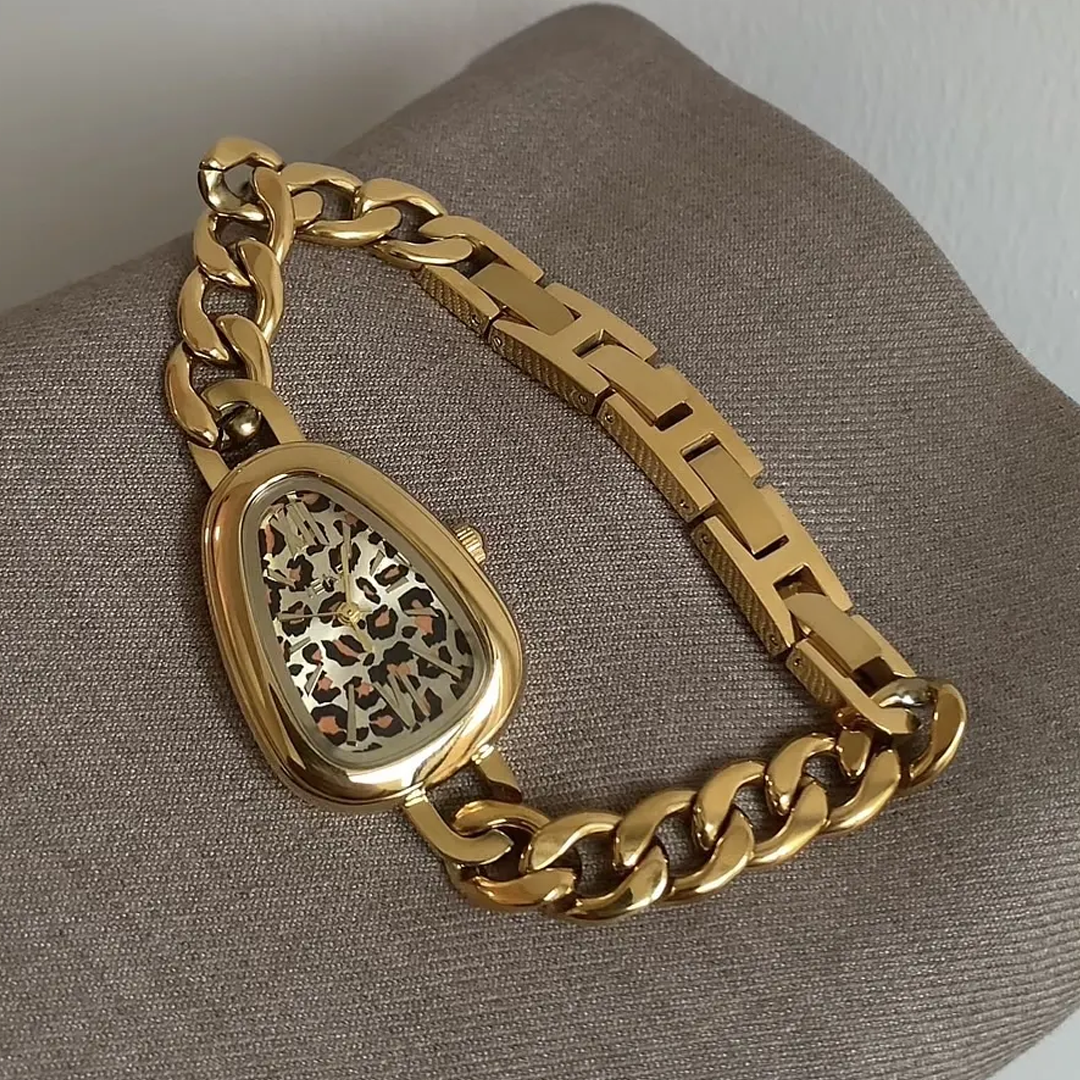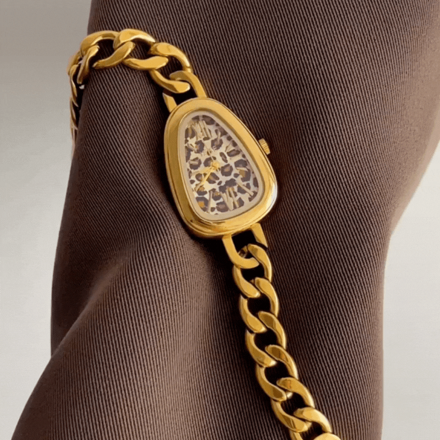 Este reloj de cuarzo para mujer combina diseño de joyería llamativo con un sentido de elegancia indomable. El audaz esfera con estampado de leopardo está enmarcado por un Pulsera con cabeza de serpiente en tono dorado, evocando poder, encanto y una fascinación eterna por el mundo natural.