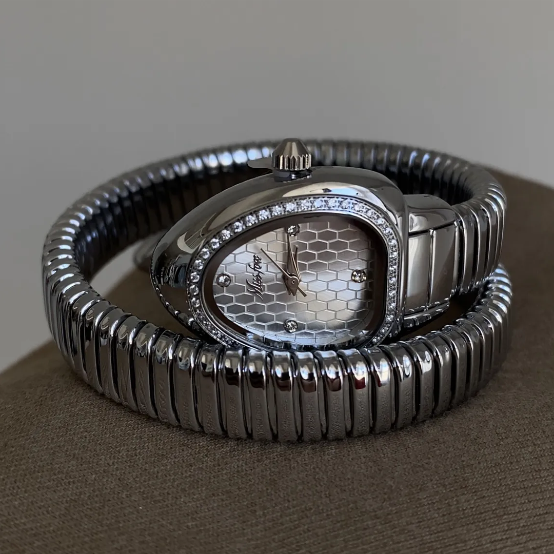 Este llamativo reloj para mujer cuenta con un mecanismo en espiral. pulsera inspirada en serpiente, coronado con un atrevido detalle de cabeza de serpiente. El esfera de piel de serpiente texturizada Añade un toque de elegancia salvaje, convirtiéndolo en un accesorio llamativo con un toque atemporal.