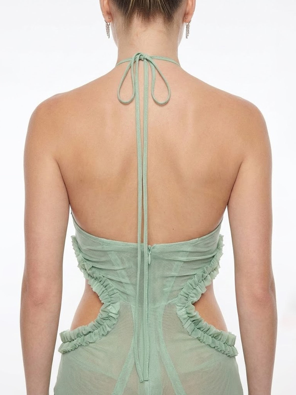 - Detail: Halter neck and side cutouts accented with butterflies and ruffles