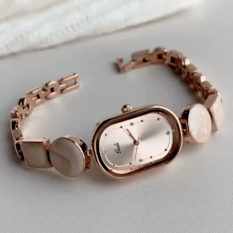 Este reloj único presenta un cautivador diseño geométrico de concha con una cadena rosa irregular, complementado por una brillante esfera de oro rosa. Perfecto para añadir un toque de elegancia moderna y feminidad a tu estilo.