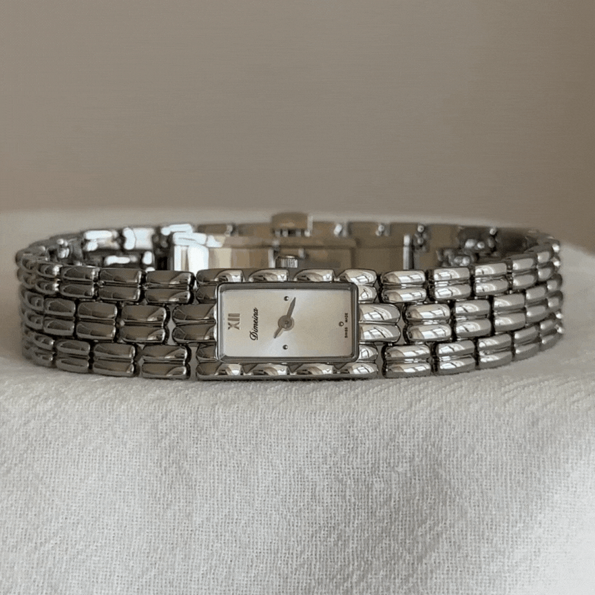 Minimalist women’s quartz watch with a sleek silver strap, rectangular case, and white dial, offering timeless elegance for daily wear.