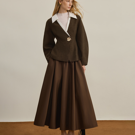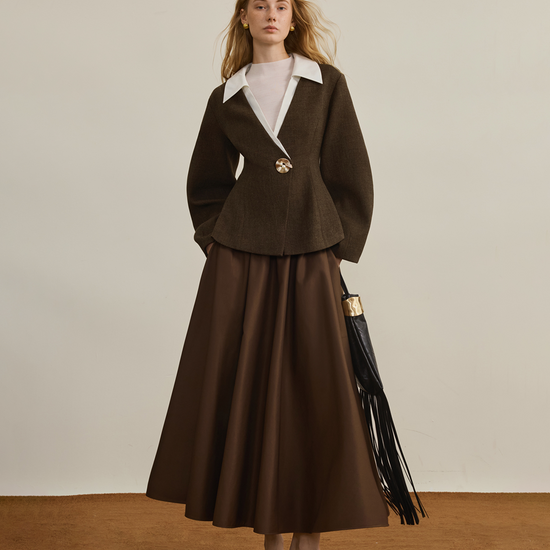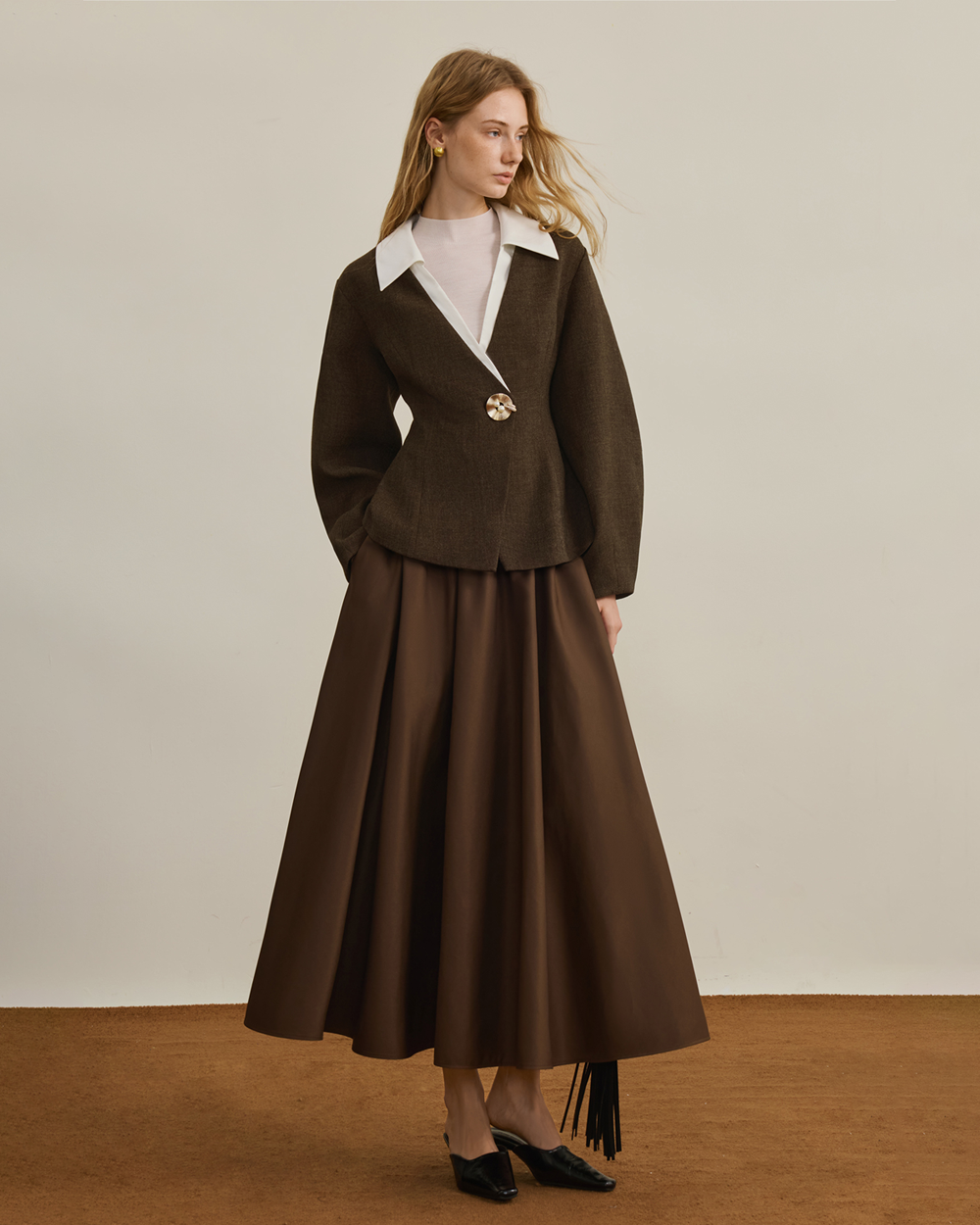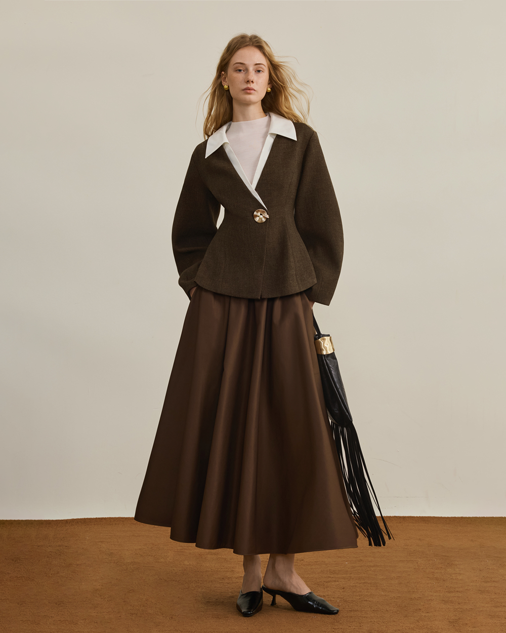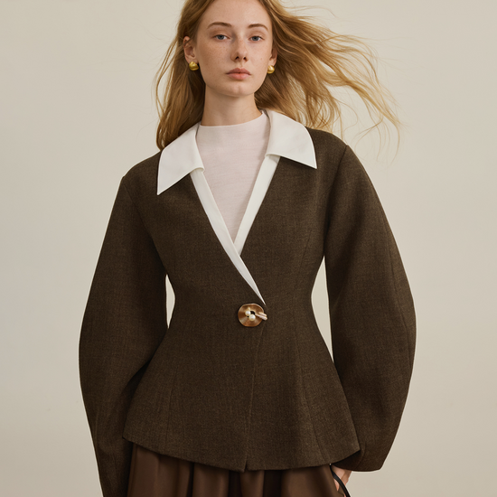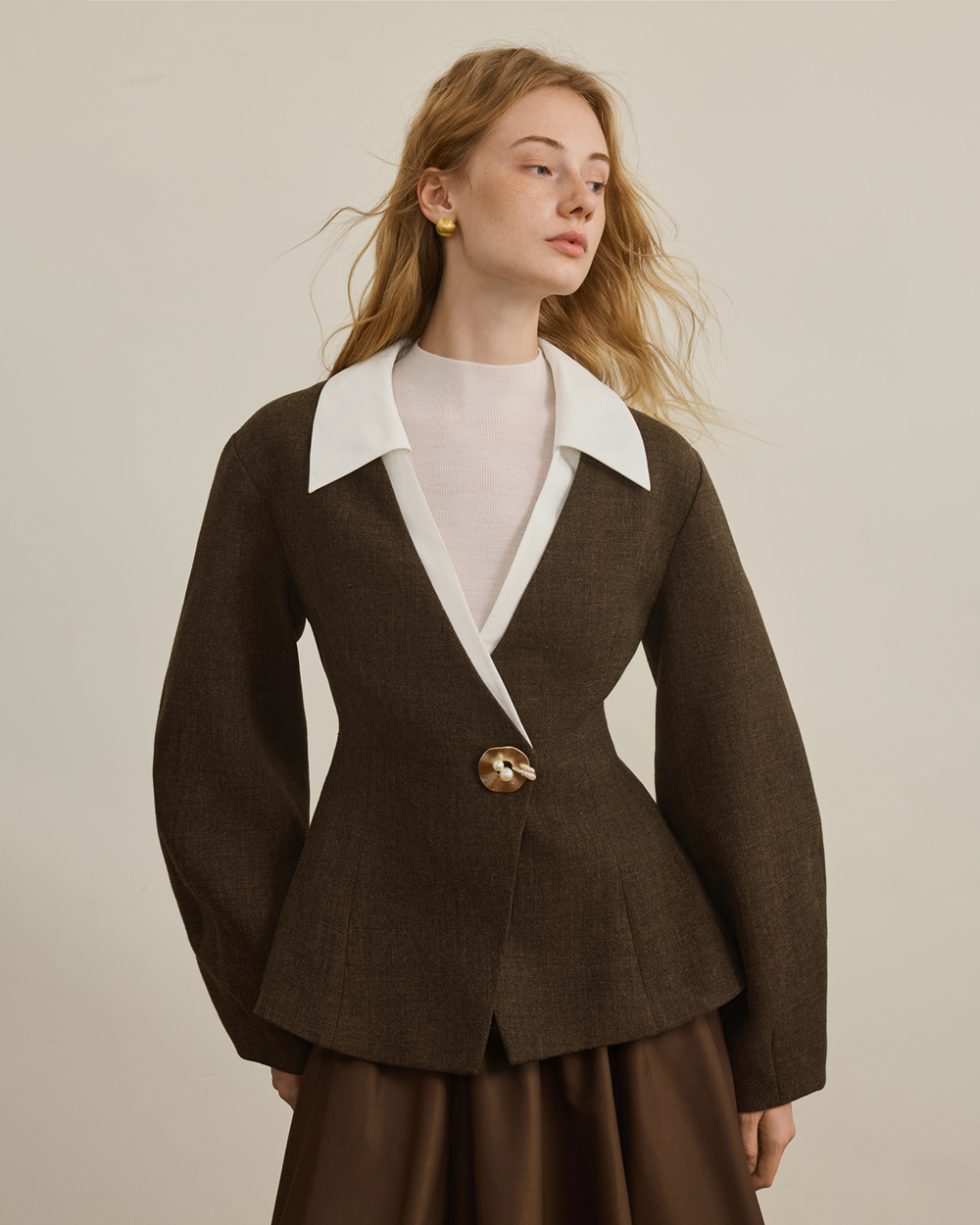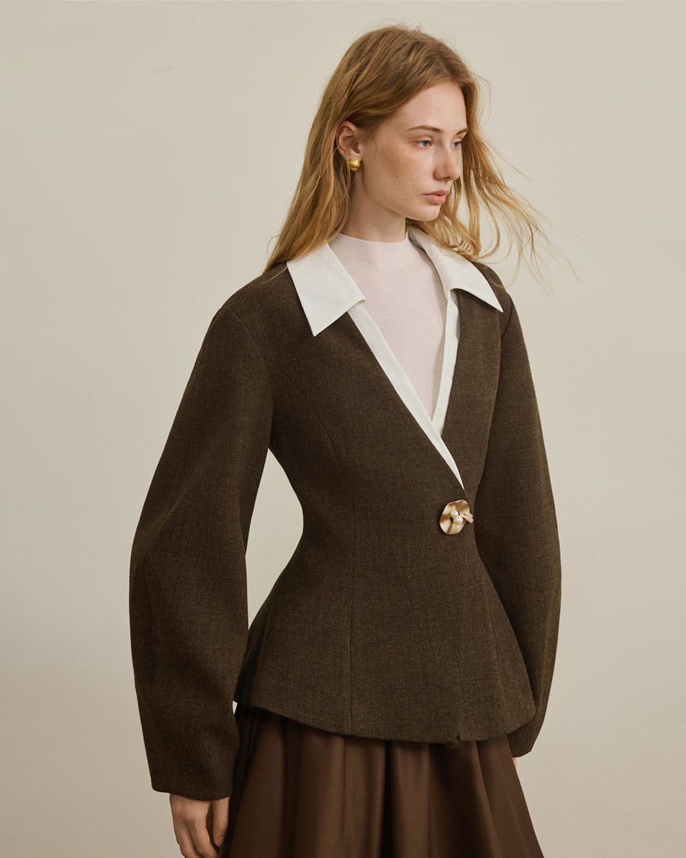 - Design Elements: Contrast wide lapel, hourglass silhouette, single-shell button detail