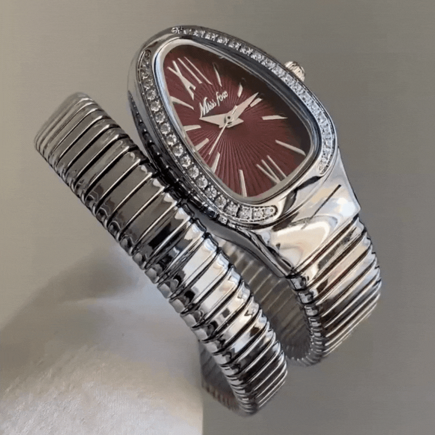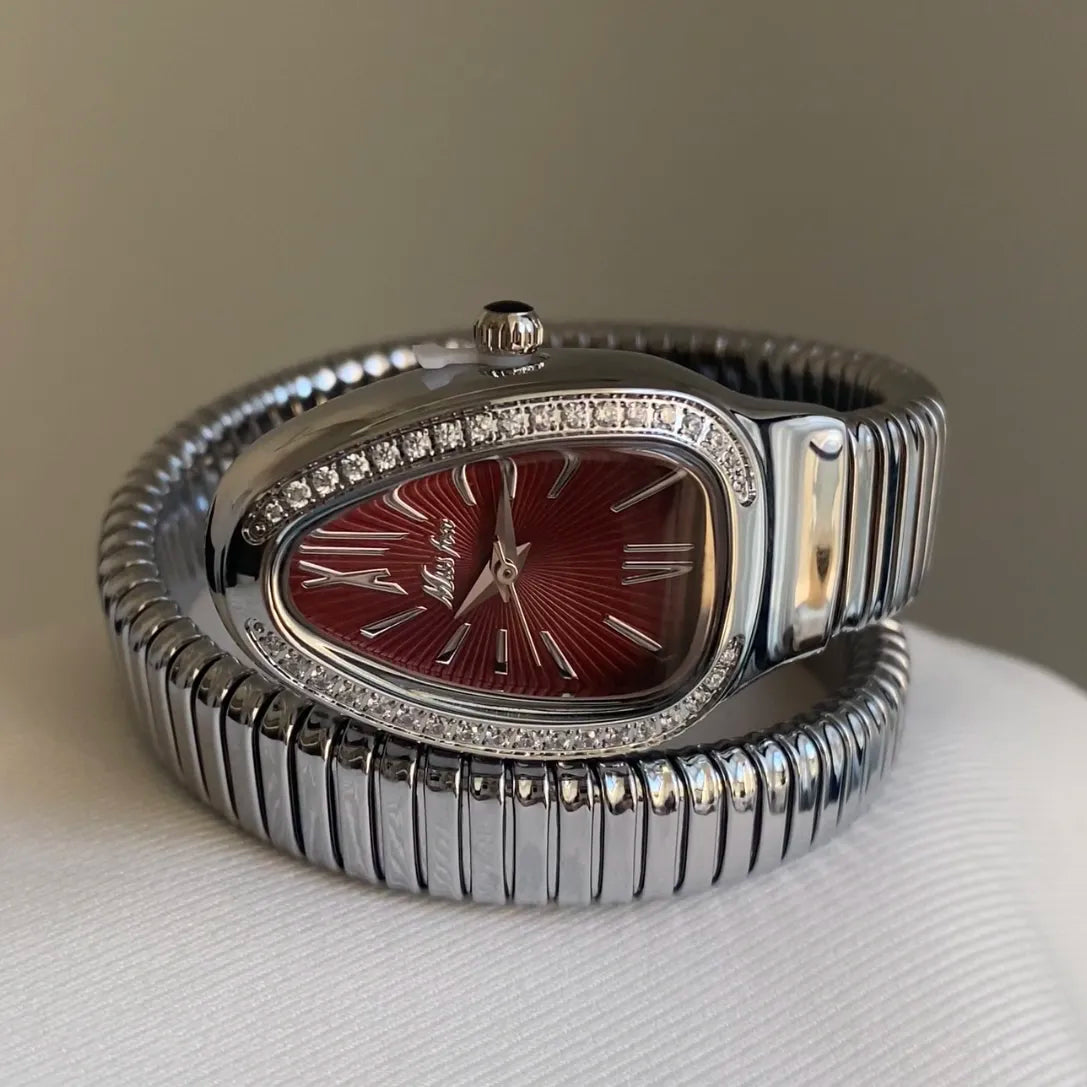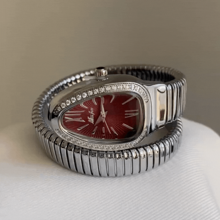 Este llamativo reloj luce una esfera roja angora con un diseño plateado inspirado en una cabeza de serpiente. El brazalete envolvente le da un toque audaz y elegante, perfecto para los amantes de la moda moderna.