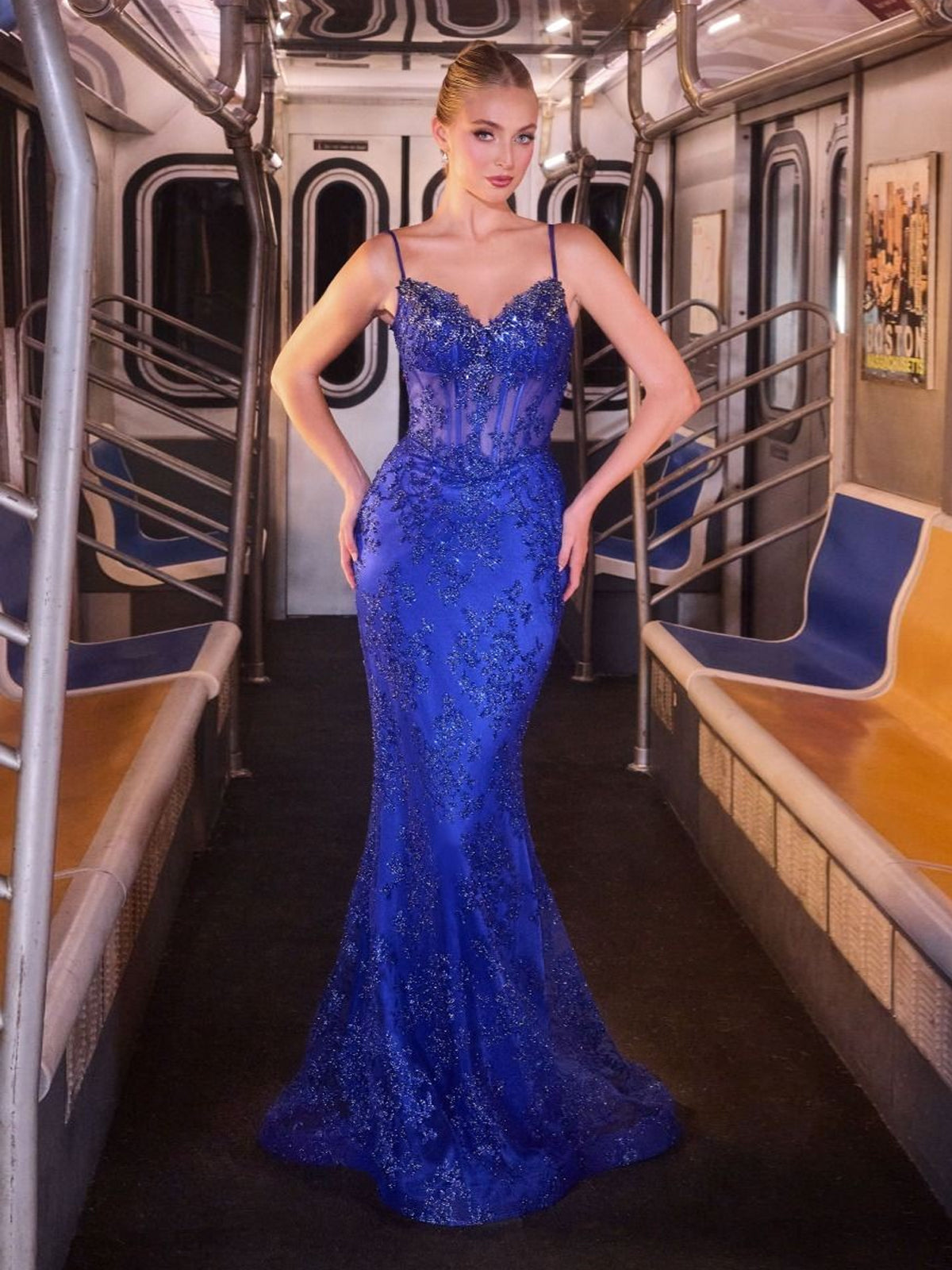 Step into the spotlight with this enchanting evening gown, crafted to create an unforgettable entrance at any formal event. The bodice features a sultry sheer corset construction with visible boning structure, providing a snatched waistline and a modern, alluring aesthetic. Intricate sequin lace appliques cascade down the figure-hugging silhouette, shimmering with every movement before flaring out into a dramatic tulle mermaid skirt with a sweeping train. Finished with delicate spaghetti straps and a low V-back, this gown balances romantic elegance with red-carpet glamour.