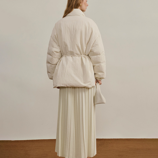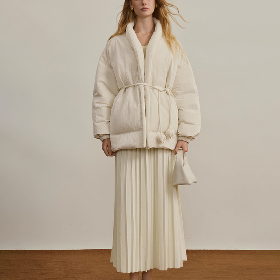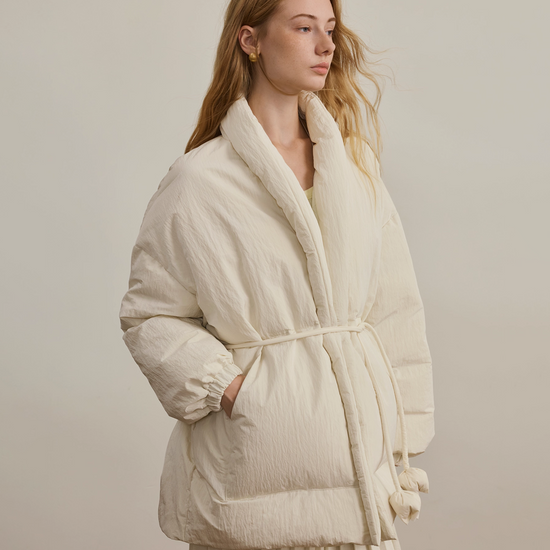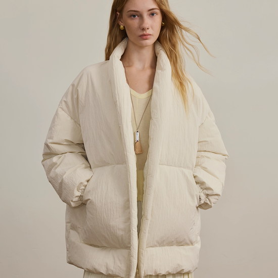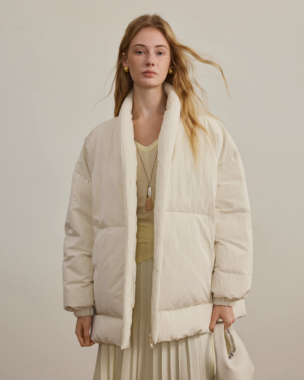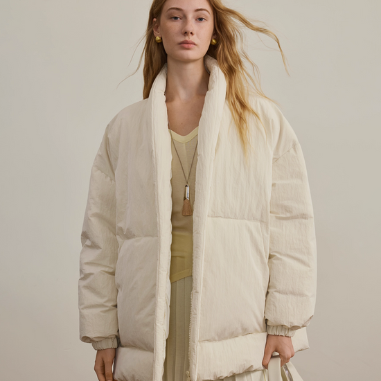 - Design Elements: Stand collar, oversized cocoon silhouette, hidden zip front with snap placket, elasticated cuffs
