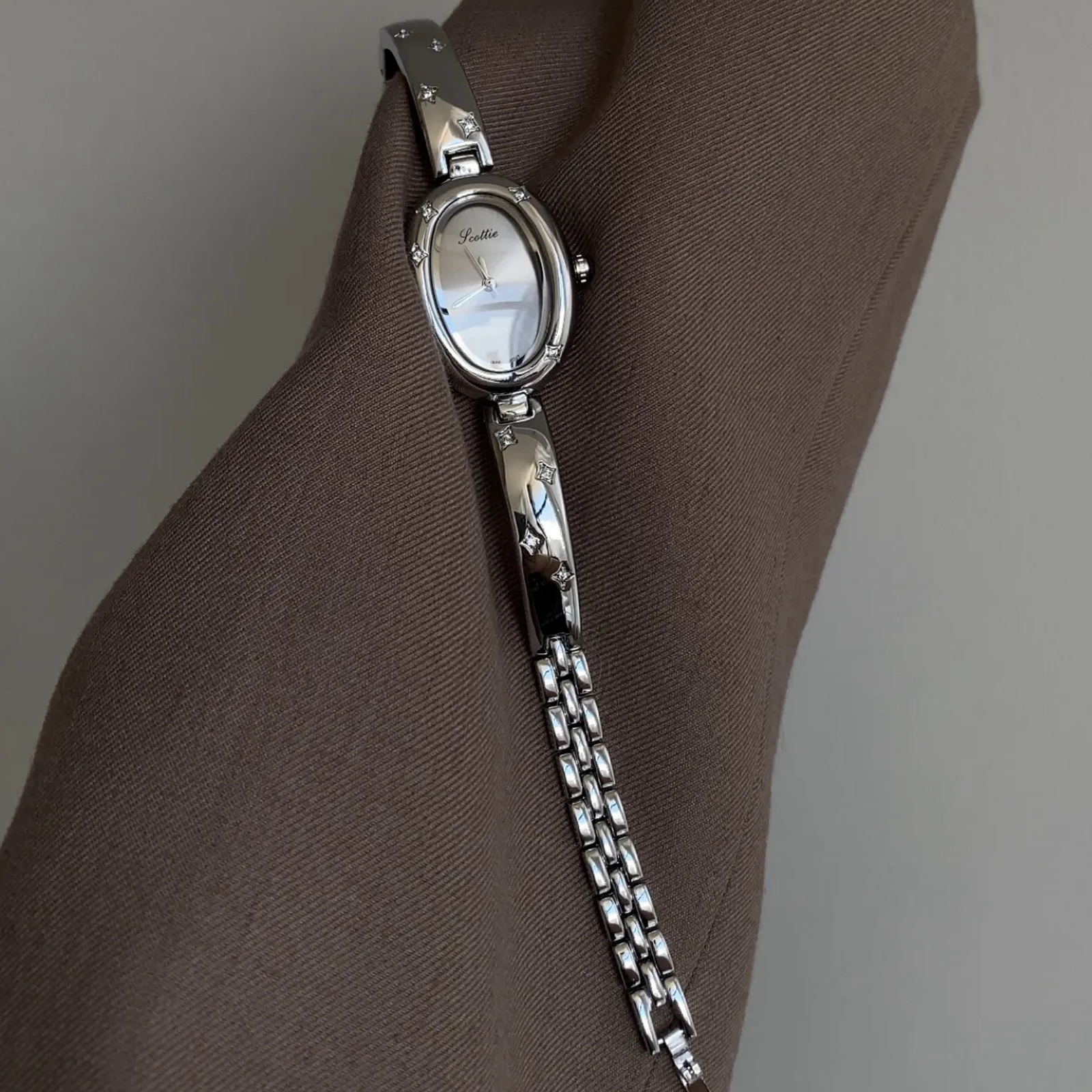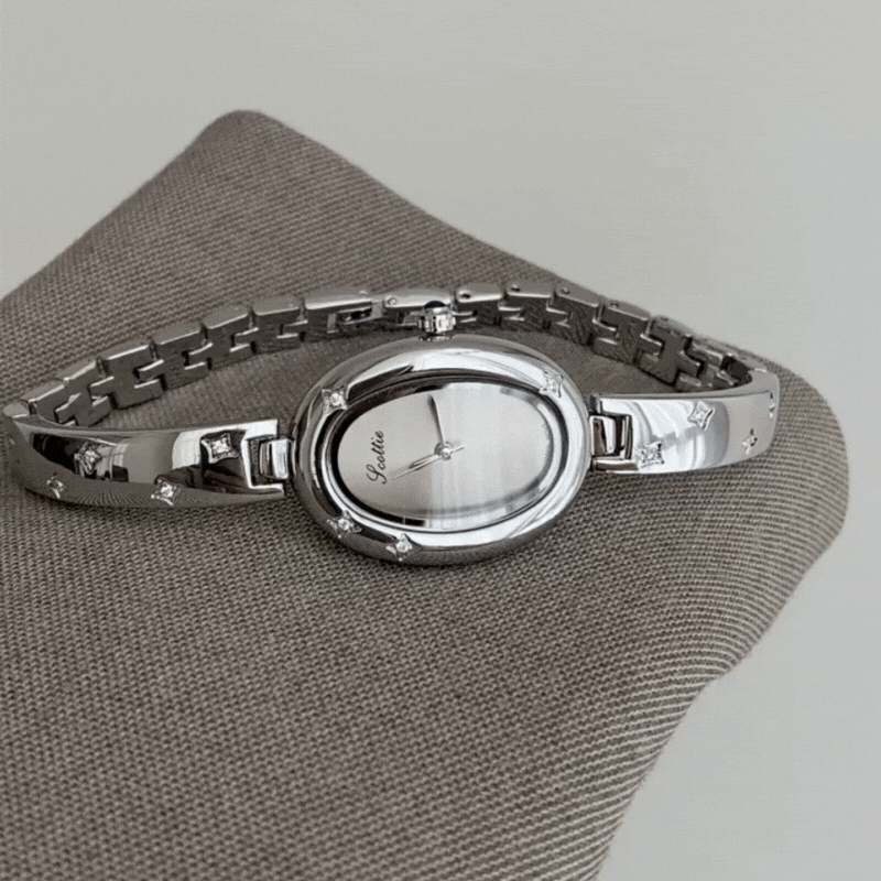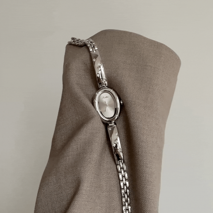 Delicado y distintivo, este reloj de cuarzo para mujer presenta una esfera esculpida esfera en forma de bañera En un acabado metálico suave, adornado con detalles de estrella grabados que brillan sutilmente cuando te mueves. El Media pulsera en tonos grises, media correa de cadena Añade elegancia arquitectónica, mezclando suavidad con estructura.
