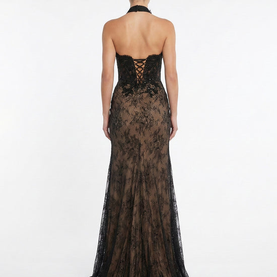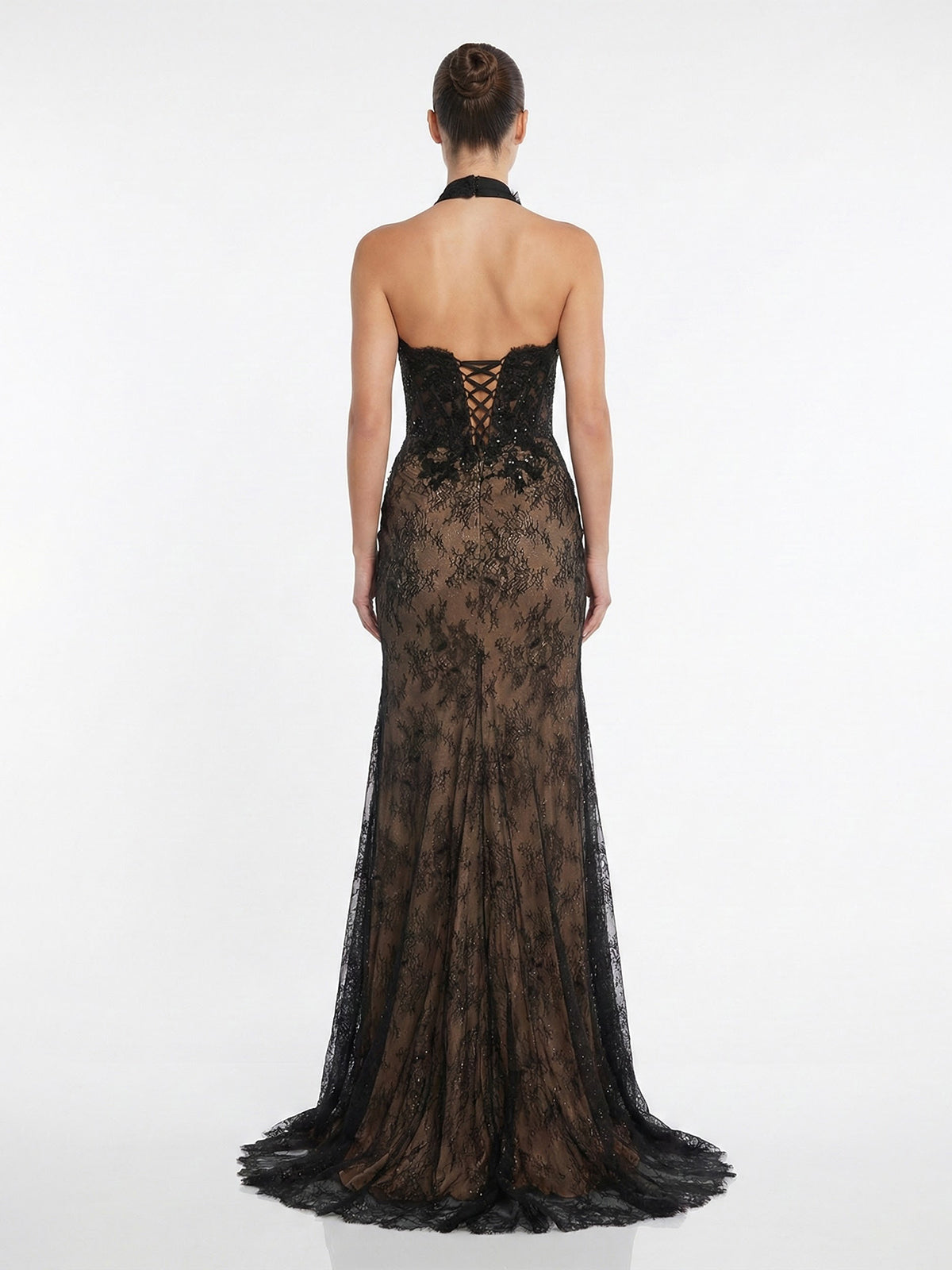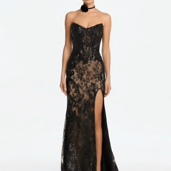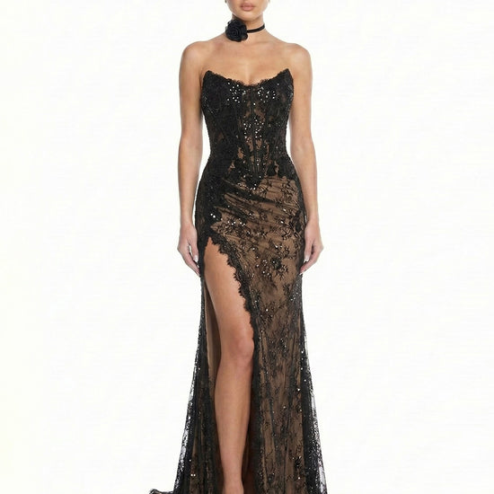 Unleash your inner dark romance in this breathtaking lace gown. The dress features a structured corset bodice with visible boning that sculpts your figure, overlaid with intricate black sequin lace for a subtle shimmer. A nude lining creates a stunning illusion effect, making the lace pattern pop. The drama continues with a daring thigh-high slit featuring a scalloped lace edge, and it’s finished with a matching floral choker to complete the high-fashion look.