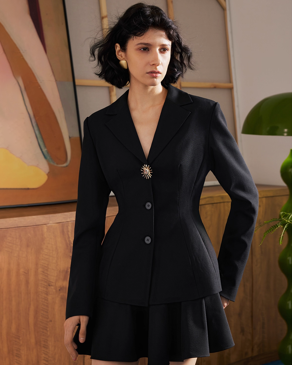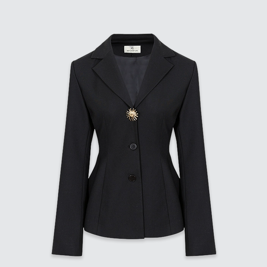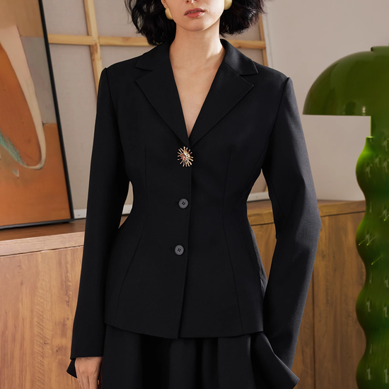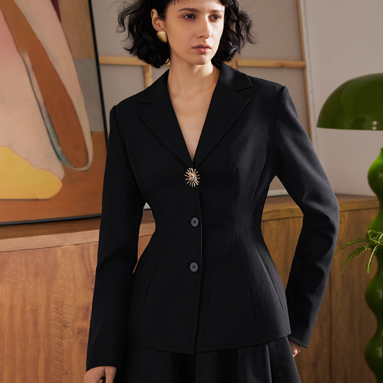 - Design Elements: Waist-fitted blazer, short pleated skirt, lapel collar, statement brooch button